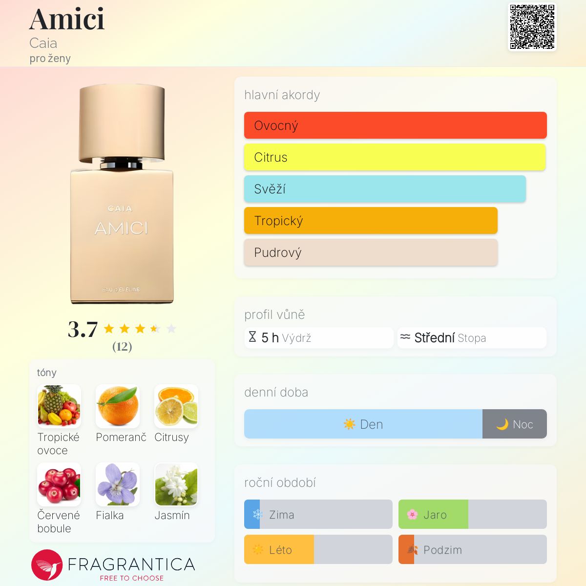 Amici podle Caia je Floral Fruity vůně pro ženy. Amici byl/a uveden/a v roce 2021. Vrchní tóny jsou Pomeranč, Citrusy, Ananas a Ostružina; střední tóny jsouTropické ovoce, Červené bobule, Fialka, Jasmín a Růže ; základní tóny jsou Kosatec, Jantar (ambra), Pižmo a Santalové dřevo.