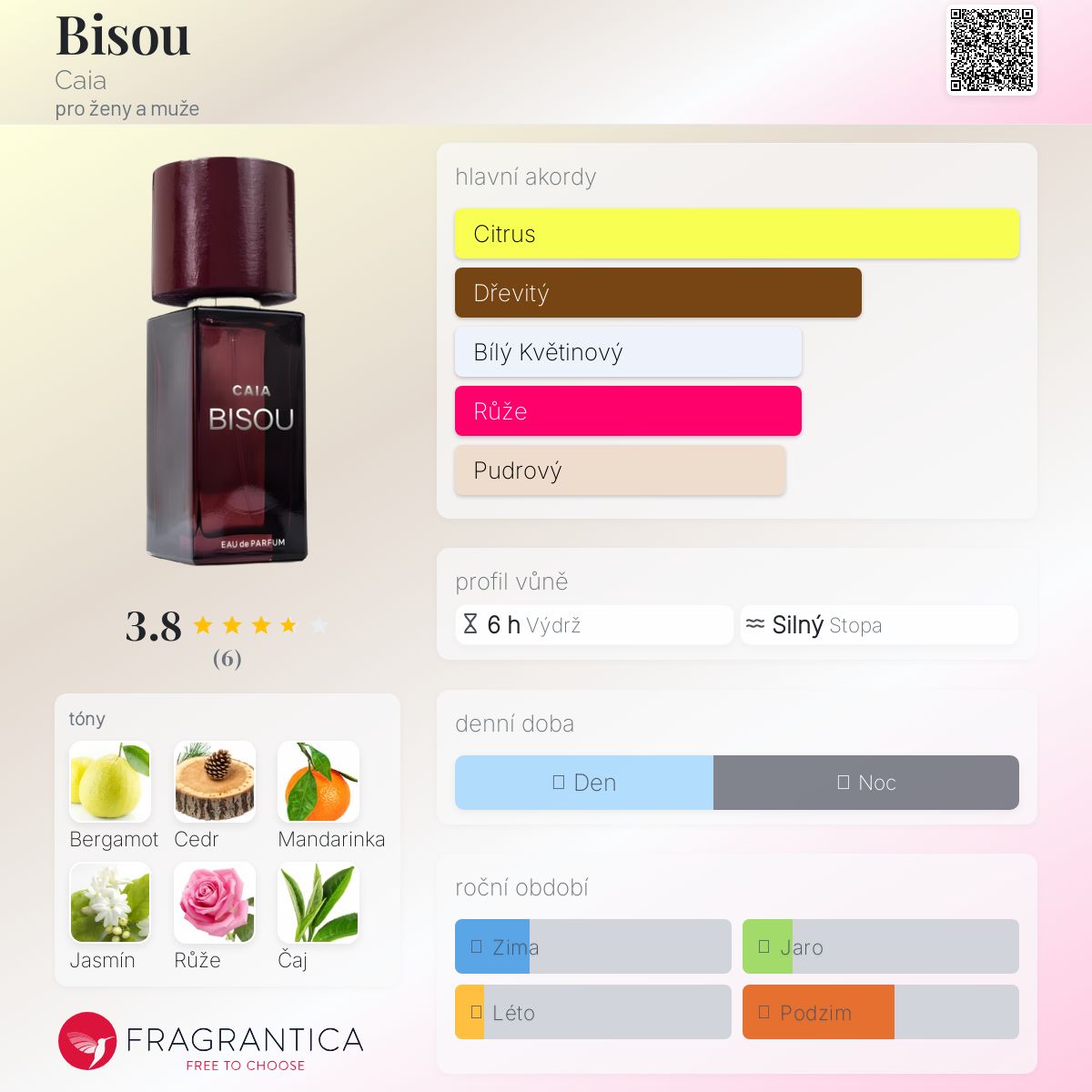 Bisou podle Caia je vůně pro ženy a muže. Bisou byl/a uveden/a v roce 2023. Vrchní tóny jsou Bergamot, Mandarinka a Kardamom; střední tóny jsouJasmín, Růže a Černý čaj ; základní tóny jsou Cedr, Pižmo, Jantar (ambra) a Pačuli.