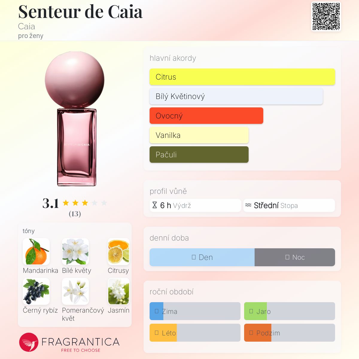 Senteur de Caia podle Caia je Citrus vůně pro ženy. Senteur de Caia byl/a uveden/a v roce 2019. Vrchní tóny jsou Mandarinka, Citrusy a Černý rybíz; střední tóny jsouBílé květy, Pomerančový květ a Jasmín ; základní tóny jsou Pačuli, Vanilka a Pižmo.