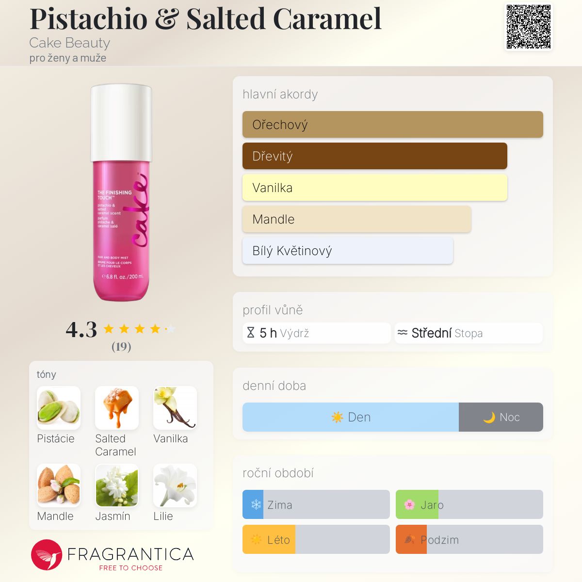 Pistachio & Salted Caramel podle Cake Beauty je Orientální Vanilla vůně pro ženy a muže. Vrchní tóny jsou Pistácie, Mandle a Bílá broskev; střední tóny jsouJasmín, Lilie a Frézie ; základní tóny jsou Slaný karamel a Vanilka.