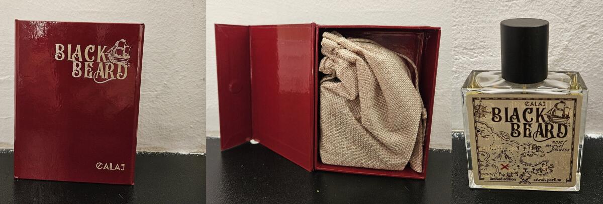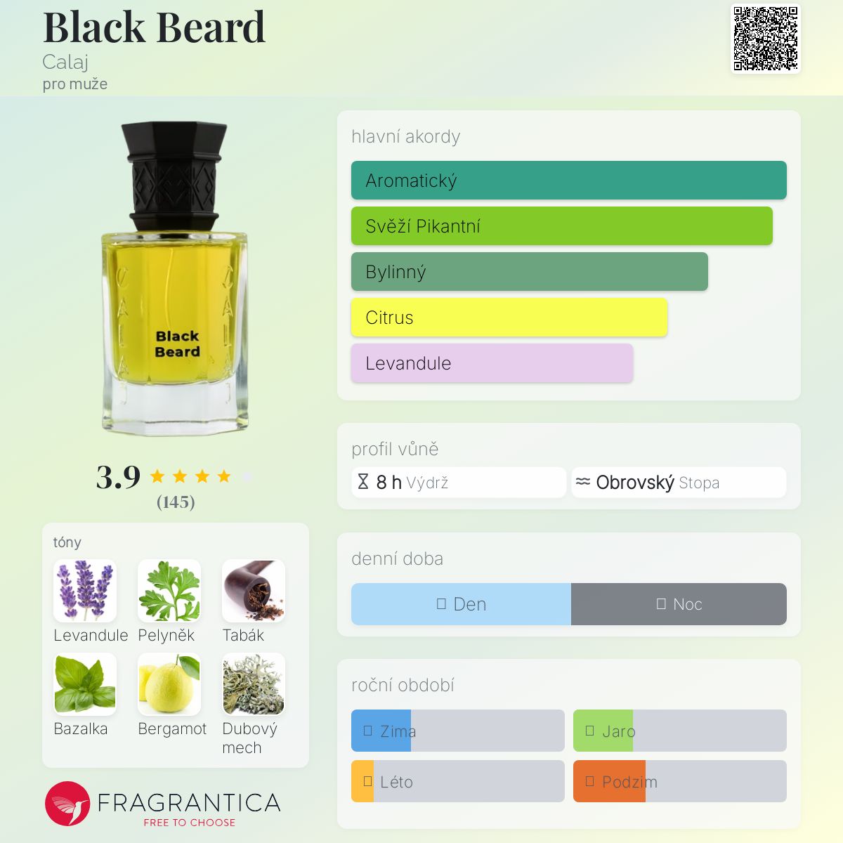 Black Beard podle Calaj je Aromatic Fougere vůně pro muže. Black Beard byl/a uveden/a v roce 2020. "Nosem" za touto vůní je Miguel Matos. Vrchní tóny jsou Pelyněk, Bazalka, Bergamot, Pomeranč a Petitgrain; střední tóny jsouLevandule, Karafiát, Pelargónie a Růže ; základní tóny jsou Tabák, Mech, Kůže, Fazole tonka, Pačuli, Jantar (ambra) a Pižmo.