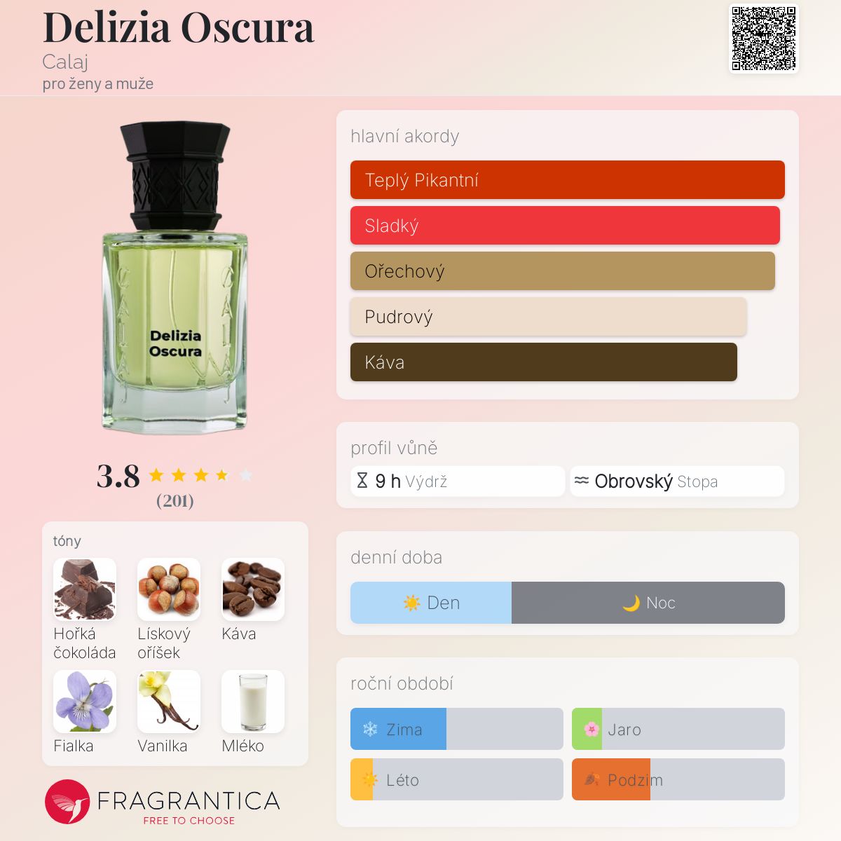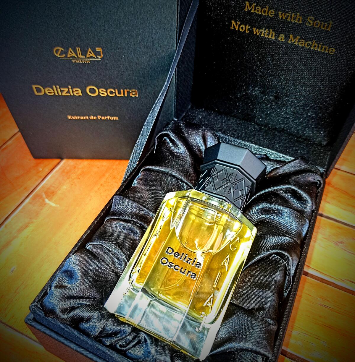 Delizia Oscura podle Calaj je vůně pro ženy a muže. Delizia Oscura byl/a uveden/a v roce 2023. "Nosem" za touto vůní je Flavius Calaj. Vrchní tóny jsou Káva, Maliny, Bergamot a Ylang-Ylang; střední tóny jsouLískový oříšek, Fialka, Mléko a Konvalinka ; základní tóny jsou Hořká čokoláda, Vanilka, Karamel a Pižmo.