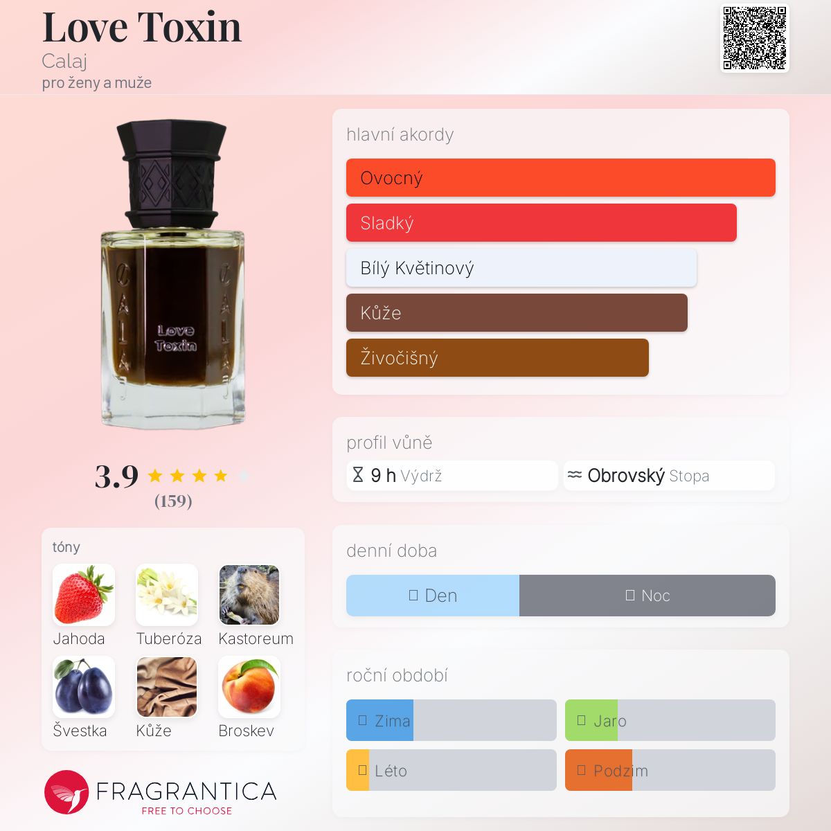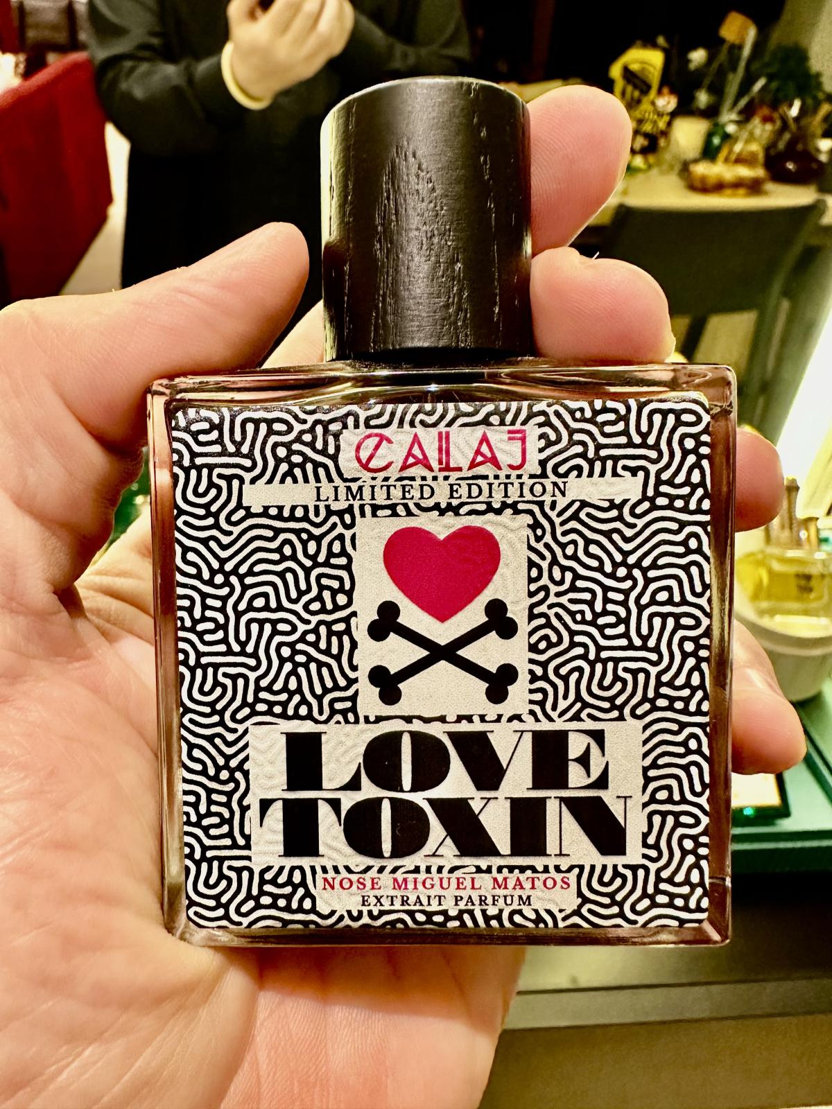 Love Toxin podle Calaj je Orientální Floral vůně pro ženy a muže. Love Toxin byl/a uveden/a v roce 2020. "Nosem" za touto vůní je Miguel Matos. Vrchní tóny jsou Jahoda, Švestka, Růže, Koriandr, Kokos a Bergamot; střední tóny jsouTuberóza, Růže, Gardénie, Kmín, Otočník, Jasmín a Kosatec ; základní tóny jsou Kastoreum, Kůže, Broskev, Opoponax, Seno, Pižmo, Dubový mech a Vanilka.