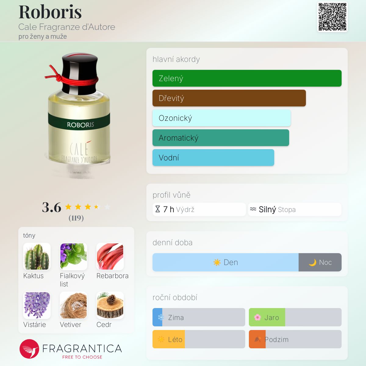 Roboris podle Cale Fragranze d’Autore je Orientální Woody vůně pro ženy a muže. Roboris byl/a uveden/a v roce 2011. Roboris byl/a vytvořen/a Silvio Levi a Mark Buxton. Vrchní tóny jsou Fialkový list, Rebarbora a Vistárie; střední tóny jsouKaktus a Jasmín ; základní tóny jsou Vetiver, Virginský cedr, Santalové dřevo, Fazole tonka a Jantar (ambra).