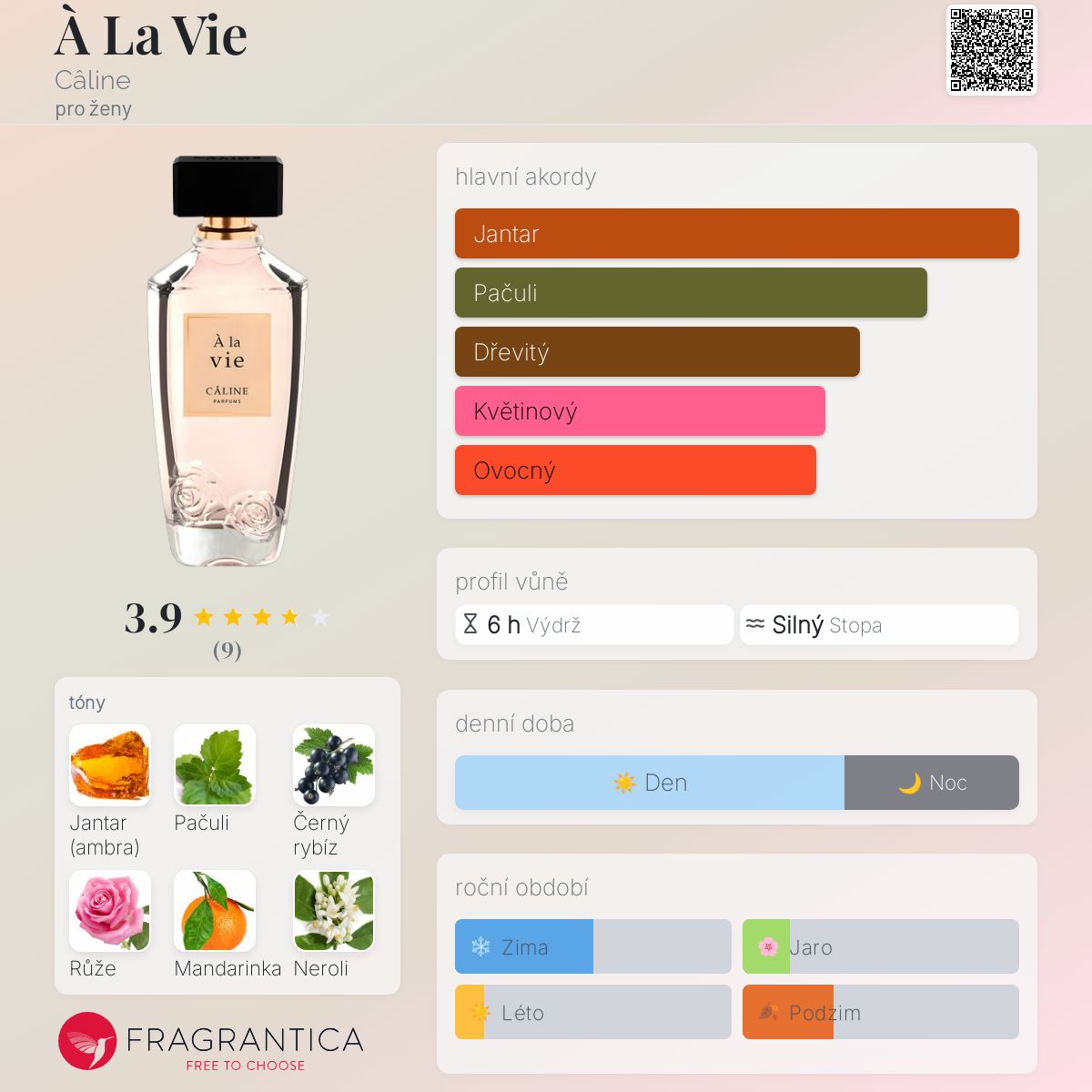 À La Vie podle Câline je Orientální Floral vůně pro ženy. À La Vie byl/a uveden/a v roce 2020. Vrchní tóny jsou Černý rybíz, Mandarinka a Bergamot; střední tóny jsouKvětná růže, Neroli, Frézie a Jasmín ; základní tóny jsou Jantar (ambra), Pačuli, Vanilka, Fazole tonka a Pižmo.