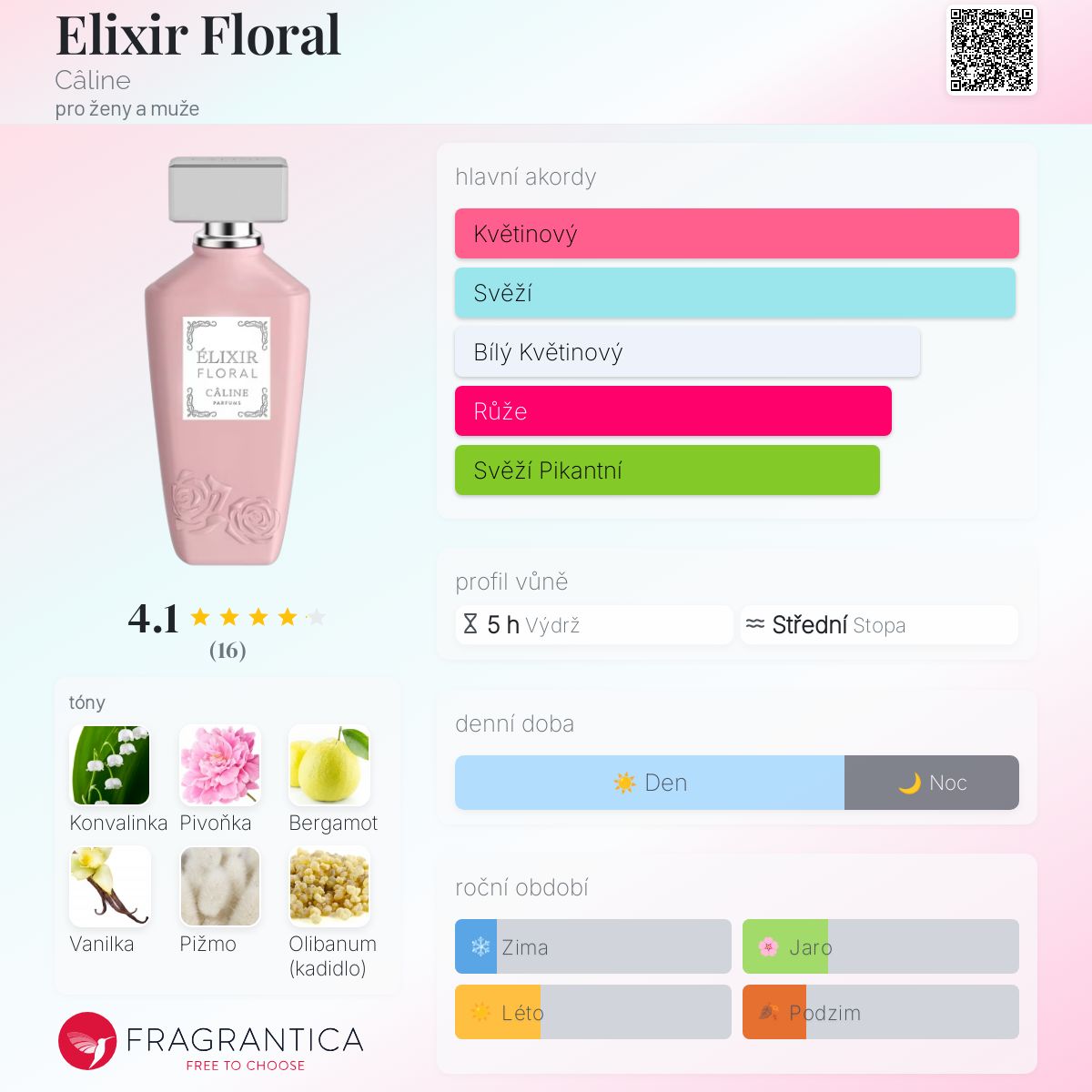 Elixir Floral podle Câline je Floral vůně pro ženy a muže. Toto je nová vůně. Elixir Floral byl/a uveden/a v roce 2025. Vrchní tóny jsou Bergamot, Rebarbora a Liči; střední tóny jsouKonvalinka, Pivoňka, Kadidlo, Muškátový oříšek, Růže a Vetiver ; základní tóny jsou Vanilka, Pižmo a Jantar (ambra).