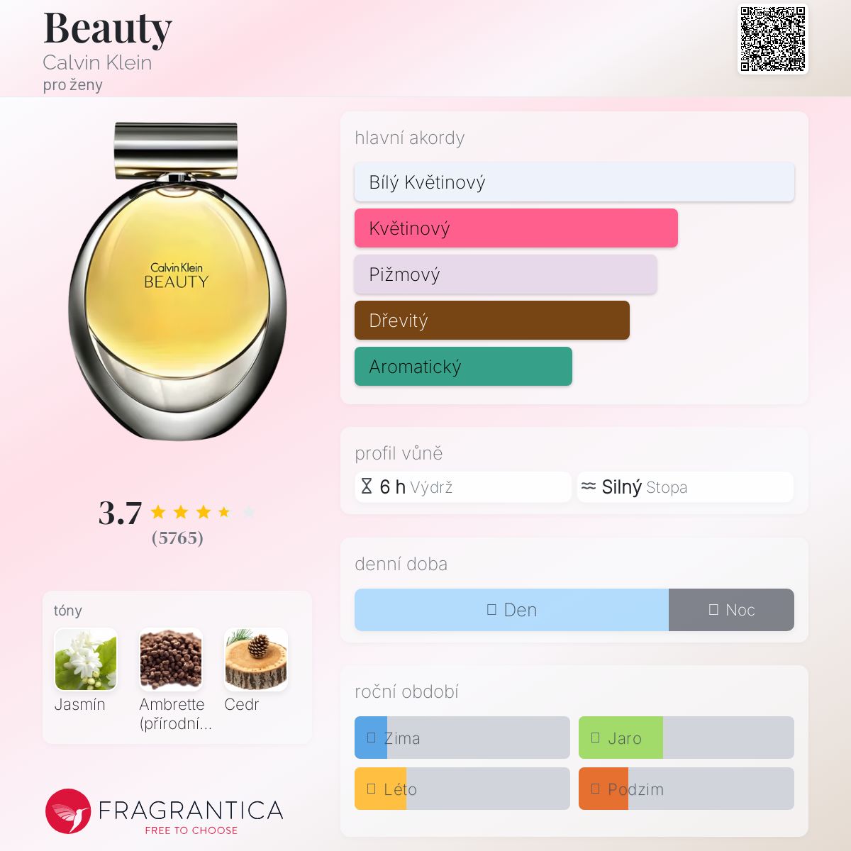 Beauty podle Calvin Klein je Floral vůně pro ženy. Beauty byl/a uveden/a v roce 2010. "Nosem" za touto vůní je Sophie Labbe. Vrchní tón je Ambrette (přírodní pižmo) ; střední tón jeJasmín ; základní tón je Virginský cedr.