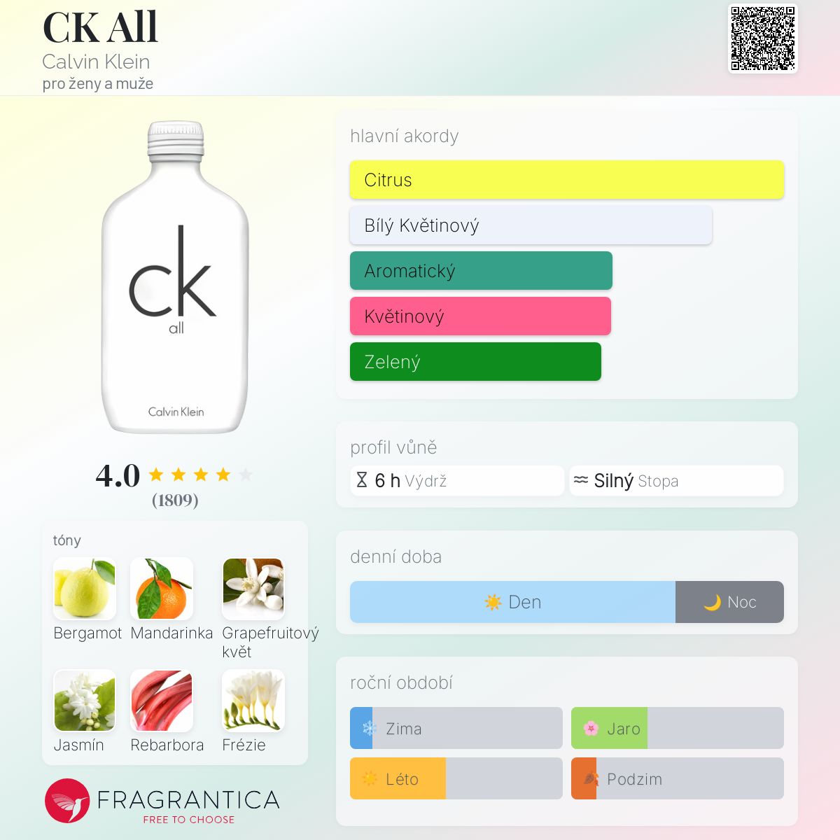 Vrchní tóny jsou jako u Ck One, ale oslazené citrusovou kůrou a nějakým bílým květinovým okrajem, velmi letní citrusově-květinové pudrové tělo nad klasickou vůní bílého trička originálu. Jakmile vyprchá, převládá poměrně snesitelná, krémová a vůbec ne mazlavá mandarinka. Nakonec nastupuje grapefruitový květ, který je jako grapefruit, ale s příchutí něžného dřeva ovocného stromu, citrusový, lehce nahořklý/kořeněný tón, jak jen květy ovocných stromů mohou být, s nádechem sprchového gelu a jeho pěny, nikoli mýdla. Nakonec má tato nóta ve spojení s bergamotem až přílišné zvýraznění, a to může Ck All umístit spíše na mužskou než na ženskou pokožku.