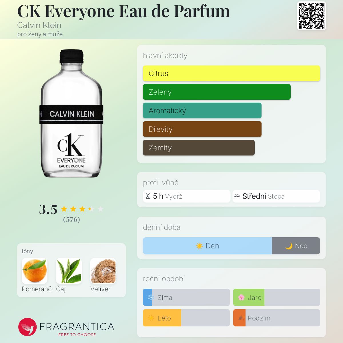 CK Everyone Eau de Parfum podle Calvin Klein je vůně pro ženy a muže. CK Everyone Eau de Parfum byl/a uveden/a v roce 2022. "Nosem" za touto vůní je Gabriela Chelariu. Vrchní tón je Pomeranč ; střední tón jeČerný čaj ; základní tón je Haitský vetiver.