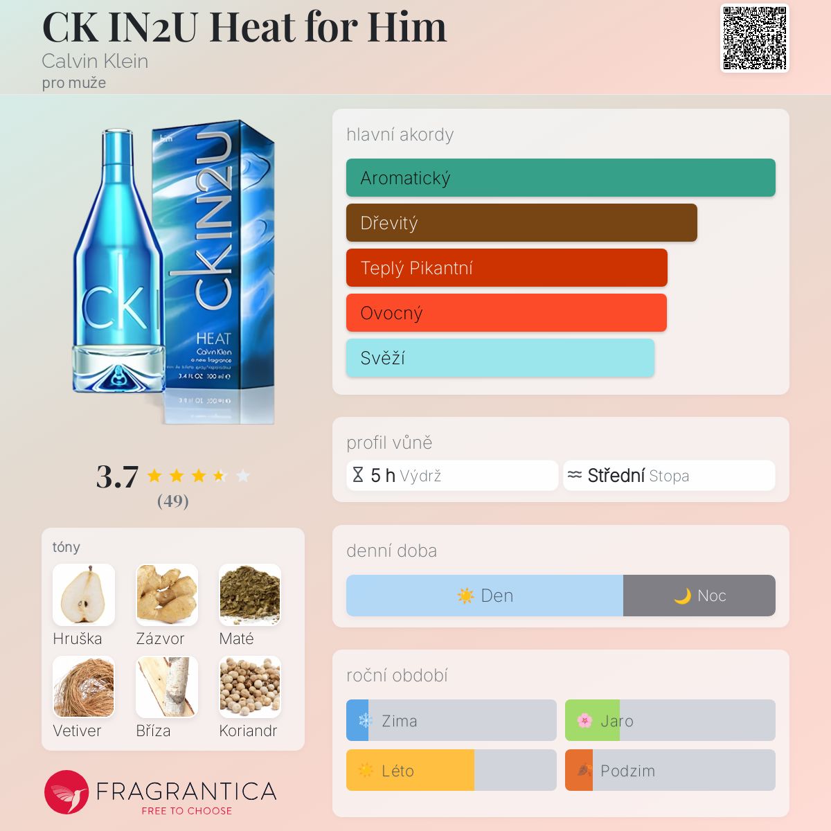 CK IN2U Heat for Him podle Calvin Klein je vůně pro muže. CK IN2U Heat for Him byl/a uveden/a v roce 2009. Vrchní tóny jsou Hruška a Koriandr; střední tóny jsouZázvor, Cesmína a Kořen kosatce ; základní tóny jsou Vetiver, Bříza a Pižmo.