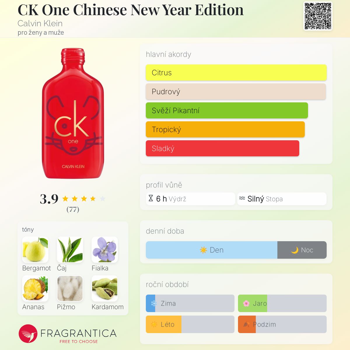CK One Chinese New Year Edition podle Calvin Klein je Citrus Aromatic vůně pro ženy a muže. CK One Chinese New Year Edition byl/a uveden/a v roce 2020. CK One Chinese New Year Edition byl/a vytvořen/a Alberto Morillas a Harry Fremont. Vrchní tóny jsou Bergamot, Ananas, Kardamom a Papája; střední tóny jsouZelený čaj, Fialka, Bílá růže a Muškátový oříšek ; základní tóny jsou Pižmo a Jantar (ambra).
