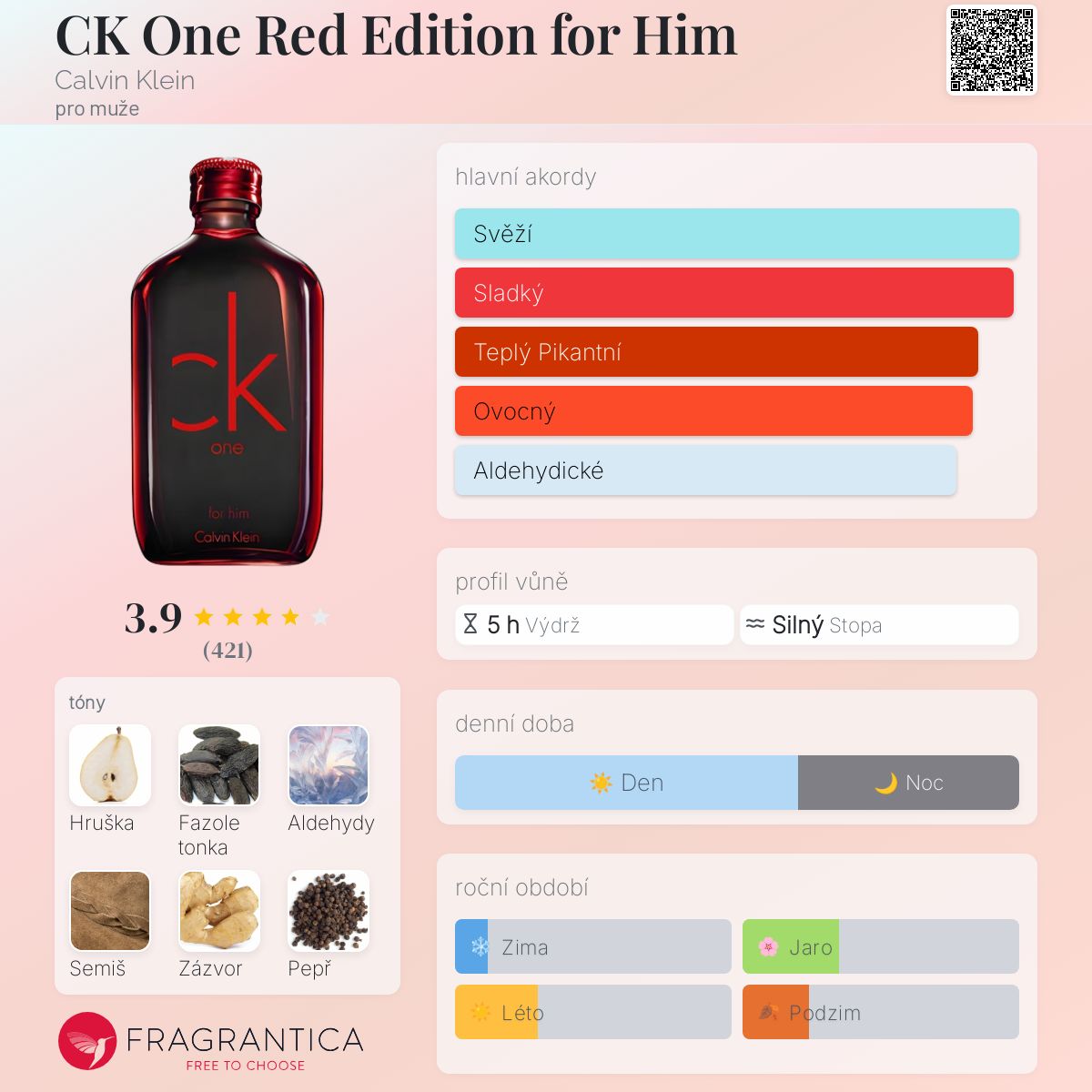 CK One Red Edition for Him podle Calvin Klein je Aromatic Spicy vůně pro muže. CK One Red Edition for Him byl/a uveden/a v roce 2014. Vrchní tóny jsou Hruška a Aldehydy; střední tóny jsouSemiš, Zázvor, Černý pepř a Daim ; základní tóny jsou Fazole tonka, Pižmo a Vetiver.