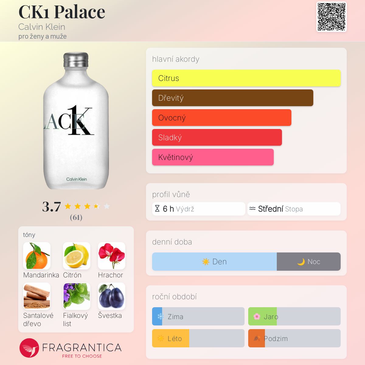 CK1 Palace podle Calvin Klein je Citrus Aromatic vůně pro ženy a muže. CK1 Palace byl/a uveden/a v roce 2022. Vrchní tóny jsou Mandarinka, Citrón a Hrachor; střední tóny jsouFialkový list, Švestka a Jablko ; základní tóny jsou Santalové dřevo, Dubový mech a Kašmírové dřevo.
