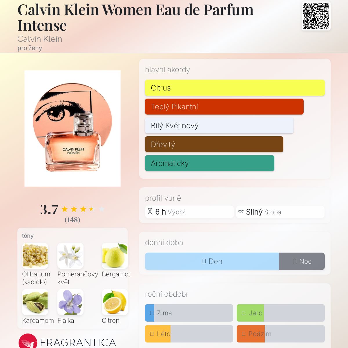 Calvin Klein Women Eau de Parfum Intense podle Calvin Klein je Orientální Floral vůně pro ženy. Calvin Klein Women Eau de Parfum Intense byl/a uveden/a v roce 2019. "Nosem" za touto vůní je Honorine Blanc. Vrchní tóny jsou Bergamot, Kardamom a Citrón; střední tóny jsouPomerančový květ, Černá fialka a Jasmín ; základní tóny jsou Olibanum, Pačuli a Santalové dřevo.