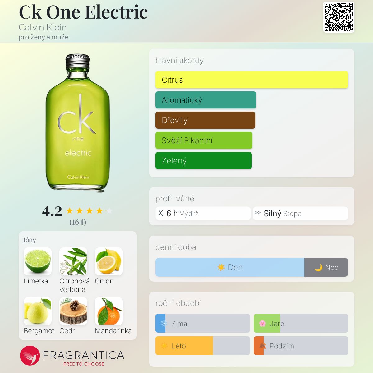 Ck One Electric podle Calvin Klein je Citrus Aromatic vůně pro ženy a muže. Ck One Electric byl/a uveden/a v roce 2006. Vrchní tóny jsou Limetka, Citronová verbena, Citrón, Bergamot, Cedr a Mandarinka; střední tóny jsouNeroli, Leknín a Fialkový list ; základní tóny jsou Cedr, Pižmo a Jantar (ambra).