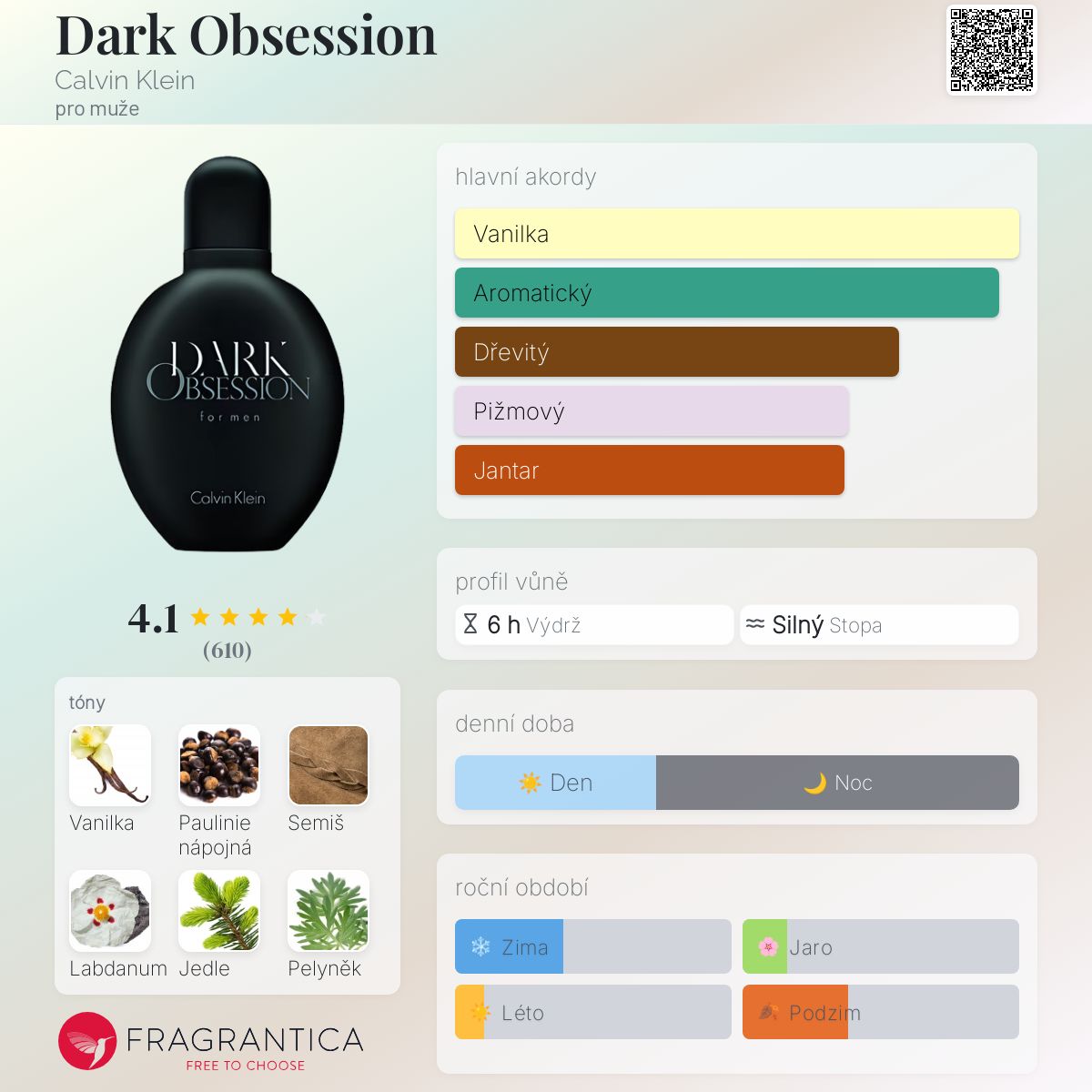 Dark Obsession podle Calvin Klein je Orientální Woody vůně pro muže. Dark Obsession byl/a uveden/a v roce 2013. Vrchní tóny jsou Paulinie nápojná, Pelyněk a Zelená mandarinka; střední tóny jsouJedle balzámová, Šalvěj muškátová a Vetiver ; základní tóny jsou Madagaskarská vanilka, Semiš a Labdanum.