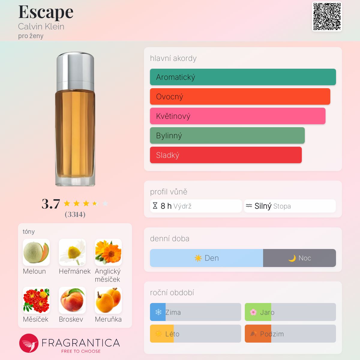 Escape podle Calvin Klein je Floral Aquatic vůně pro ženy. Escape byl/a uveden/a v roce 1991. "Nosem" za touto vůní je Claude Dir. Vrchní tóny jsou Meloun, Heřmánek, Měsíček, Aksamitník, Meruňka, Hyacint, Dubový mech, Jablko, Koriandr, Mandarinka, Ylang-Ylang, Černý rybíz, Liči a Kasie; střední tóny jsouBroskev, Konvalinka, Karafiát, Růže, Jasmín a Hřebíček ; základní tóny jsou Dubový mech, Pižmo, Santalové dřevo, Jantar (ambra), Vetiver, Cedr a Vanilka.