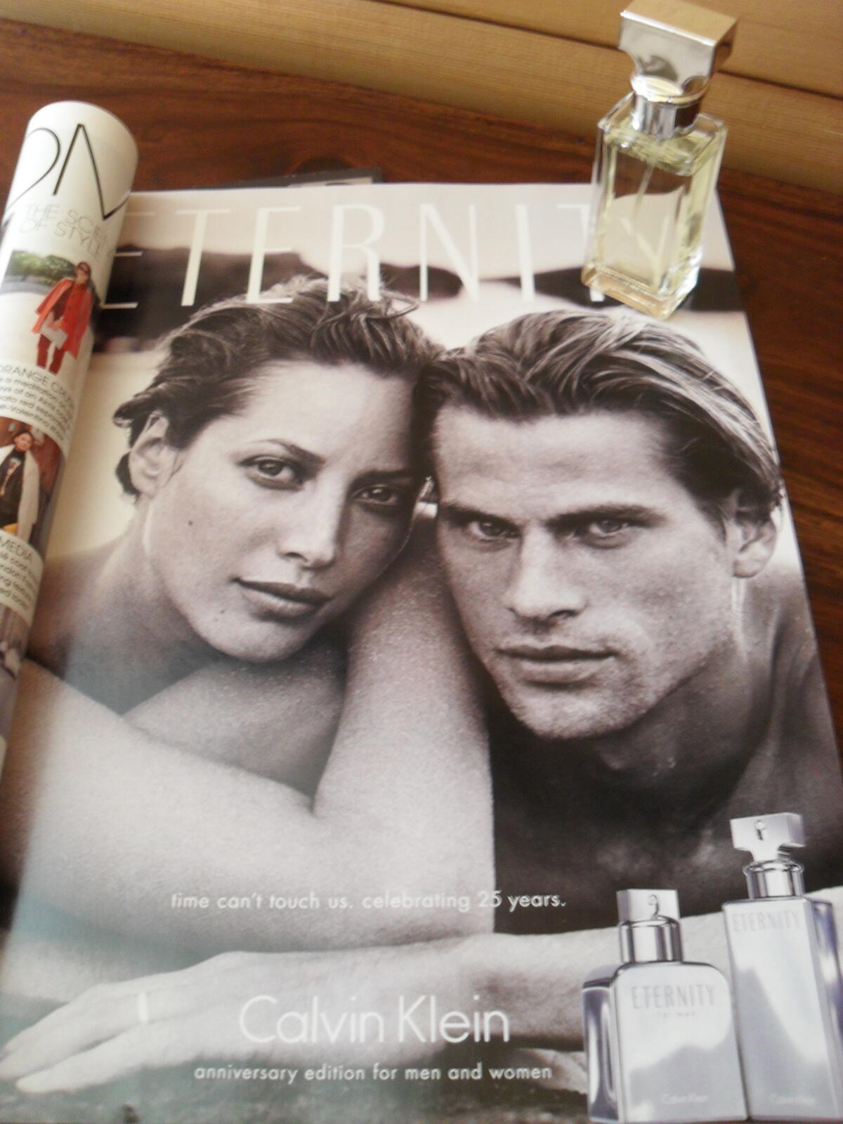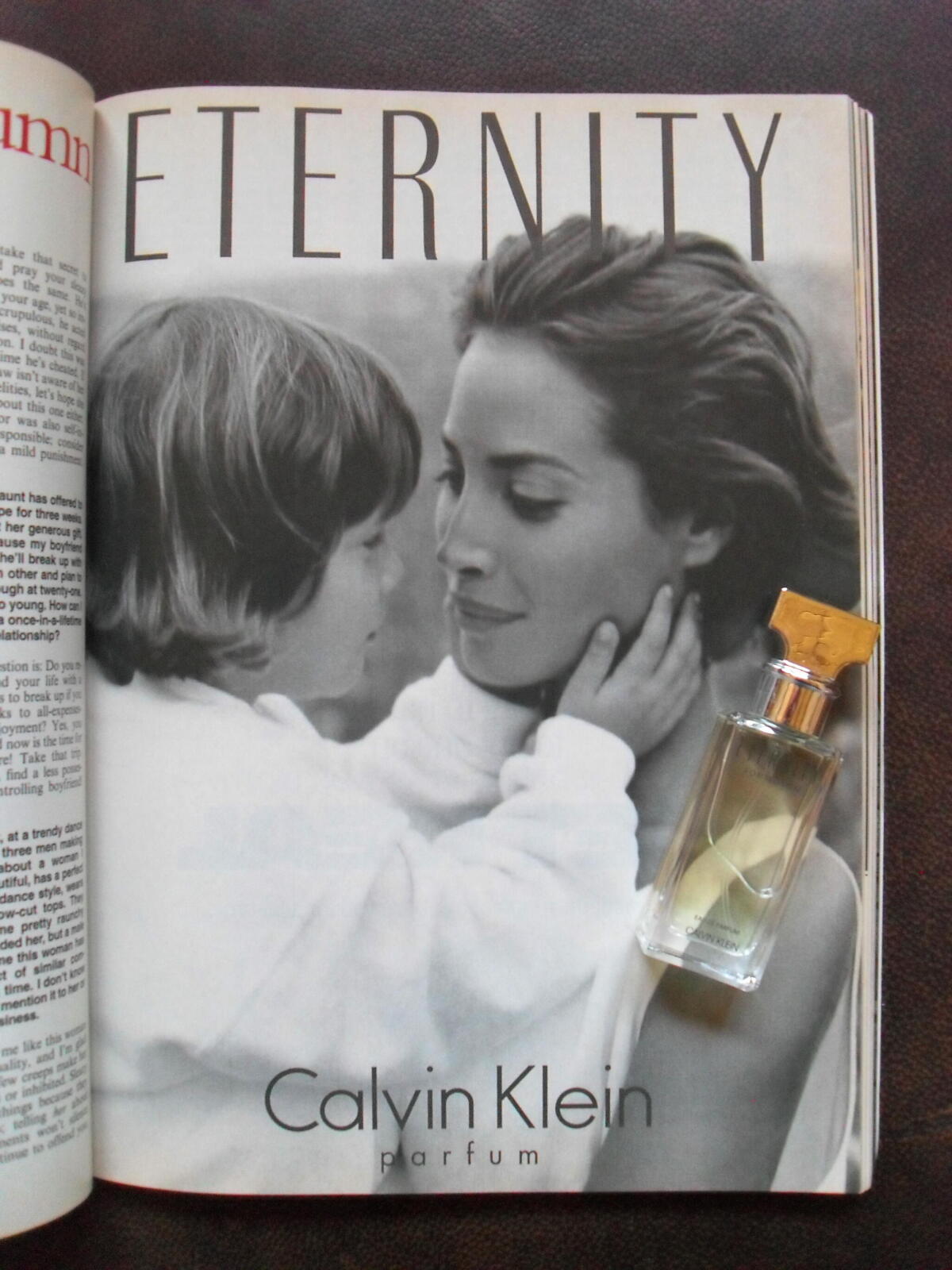 Chtěl bych jen upozornit na to, jak byl tento produkt původně uváděn na trh. Eternity byla uvedena na trh koncem 80. let, takže si zachovává přístup "všechno, jen ne kuchyňský dřez", který se používal k vytváření velkých a odvážných výtvorů, jež si člověk spojuje s touto dekádou. Následovala po velkém úspěchu Obsession, která, jak název napovídá, byla celá marketingově zaměřená na vášnivý, nebezpečný parfém, no, posedlost.