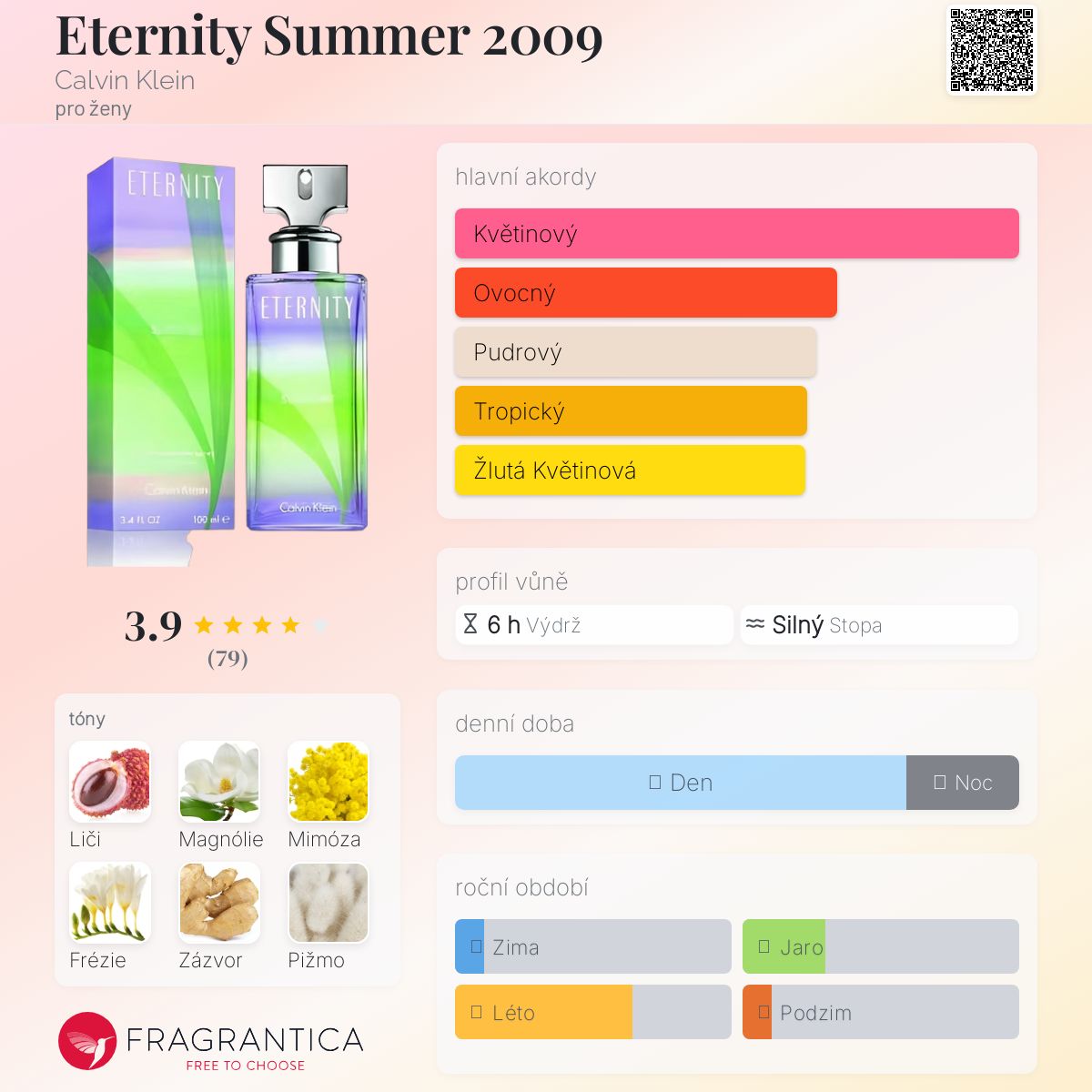 Eternity Summer 2009 podle Calvin Klein je Floral vůně pro ženy. Eternity Summer 2009 byl/a uveden/a v roce 2009. Vrchní tóny jsou Liči a Zázvor; střední tóny jsouMagnólie, Mimóza a Frézie ; základní tóny jsou Pižmo, Cedr a Fazole tonka.