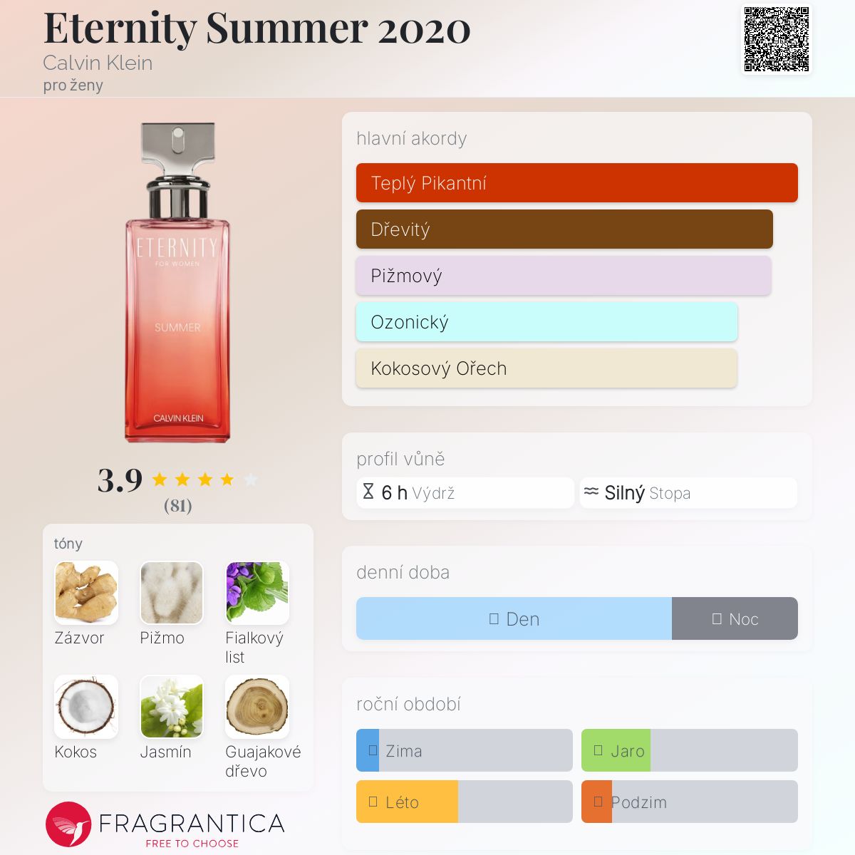 Eternity Summer 2020 podle Calvin Klein je Floral vůně pro ženy. Eternity Summer 2020 byl/a uveden/a v roce 2020. Vrchní tóny jsou Fialkový list, Růže a Bergamot; střední tóny jsouZázvor, Kokosový nektar a Jasmín Sambac ; základní tóny jsou Pižmo, Guajakové dřevo a Vetiver.
