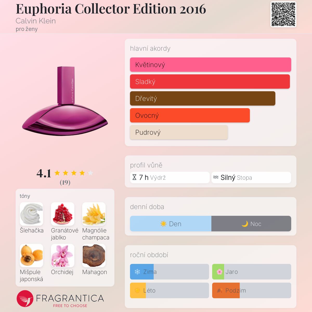 Euphoria Collector Edition 2016 podle Calvin Klein je Orientální Floral vůně pro ženy. Euphoria Collector Edition 2016 byl/a uveden/a v roce 2016. Vrchní tóny jsou Granátové jablko, Mišpule japonská a Zelený tón; střední tóny jsouMagnólie champaca, Černá orchidej a Lotus ; základní tóny jsou Šlehačka, Mahagon, Jantar (ambra) a Fialka.