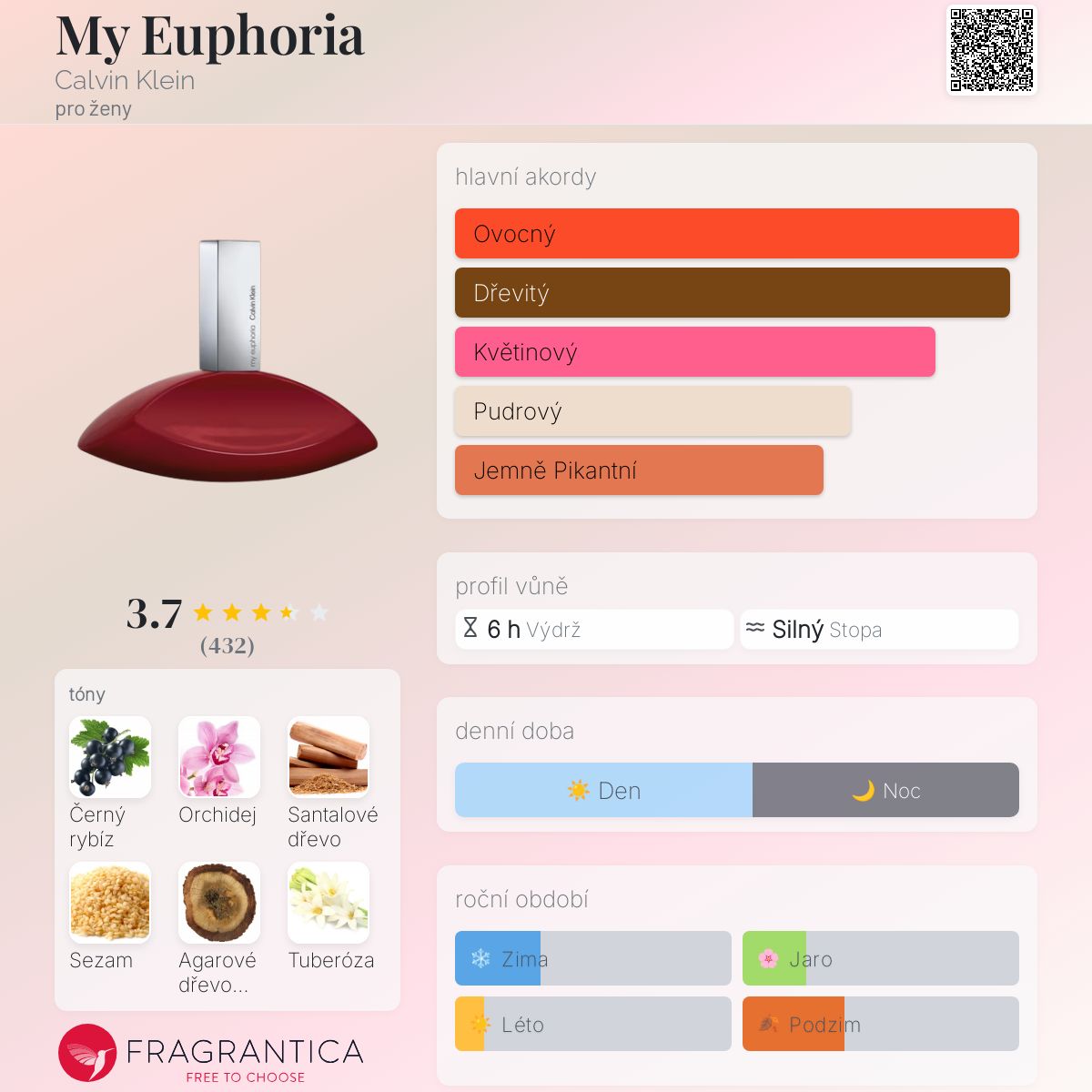 My Euphoria podle Calvin Klein je Orientální Floral vůně pro ženy. Toto je nová vůně. My Euphoria byl/a uveden/a v roce 2023. My Euphoria byl/a vytvořen/a Frank Voelkl a Nathalie Lorson. Vrchní tón je Černý rybíz ; střední tóny jsouOrchidej, Sezam a Tuberóza ; základní tóny jsou Santalové dřevo, Agarové dřevo (oud) a Bambus.