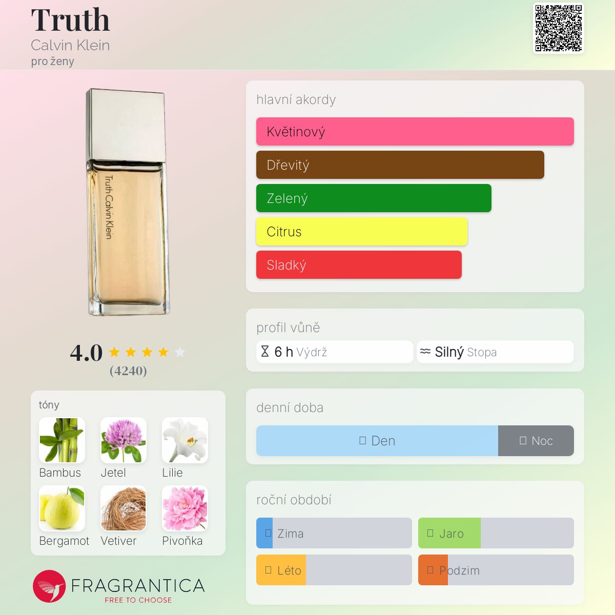 Truth podle Calvin Klein je Orientální Woody vůně pro ženy. Truth byl/a uveden/a v roce 2000. Truth byl/a vytvořen/a Alberto Morillas, Jacques Cavallier Belletrud a Thierry Wasser. Vrchní tóny jsou Bambus, Jetel, Bergamot, Vetiver, Citrón a Pačuli; střední tóny jsouLilie, Pivoňka, Santalové dřevo, Mimóza, Květ hedvábného dřeva a Ostružina ; základní tóny jsou Pižmo, Vanilka a Jantar (ambra).