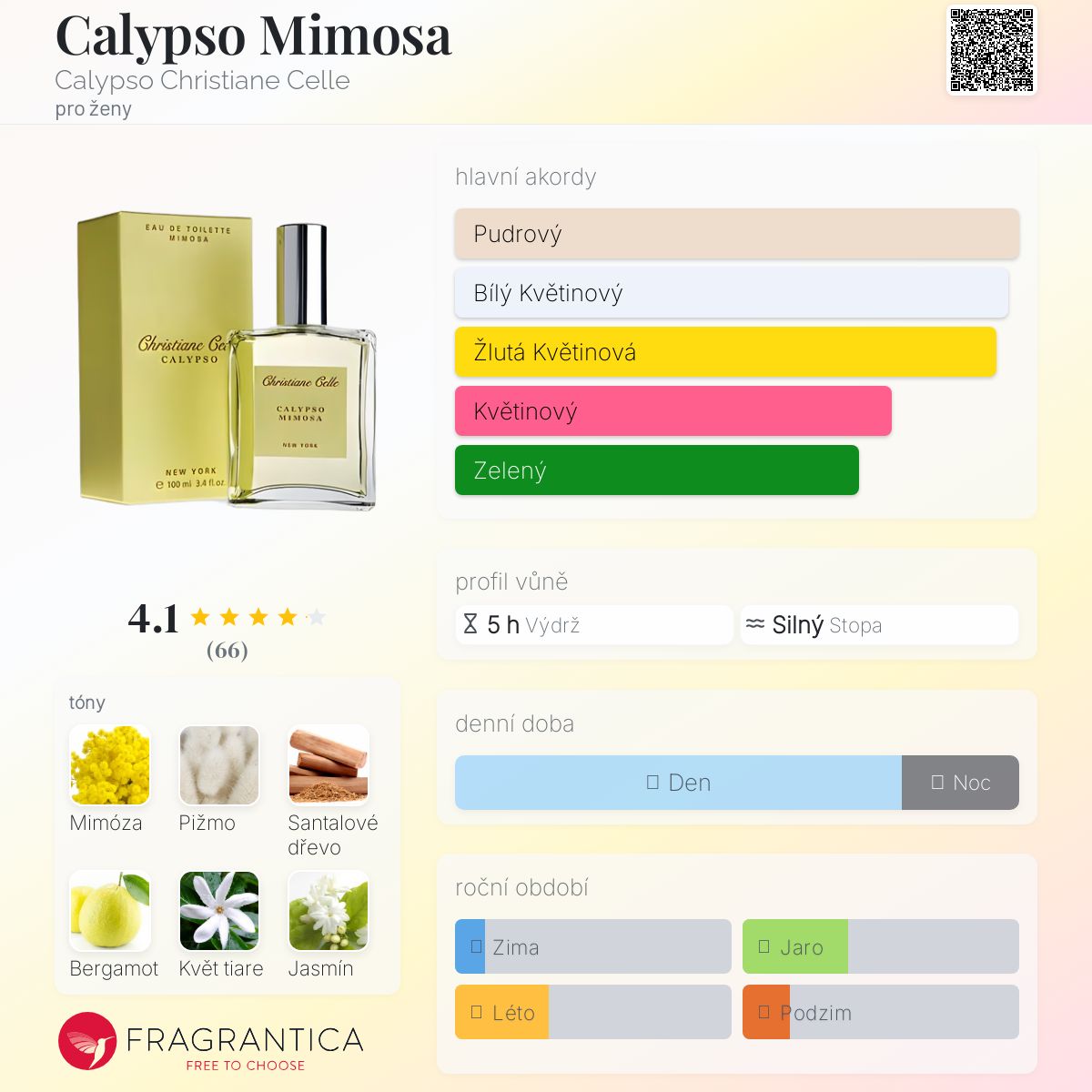 Calypso Mimosa podle Calypso Christiane Celle je Floral vůně pro ženy. Calypso Mimosa byl/a uveden/a v roce 1998. "Nosem" za touto vůní je Francis Camail. Vrchní tóny jsou Bergamot, Neroli a Mandle; střední tóny jsouMimóza, Jasmín a Tuberóza ; základní tóny jsou Pižmo, Santalové dřevo a Květ tiare.