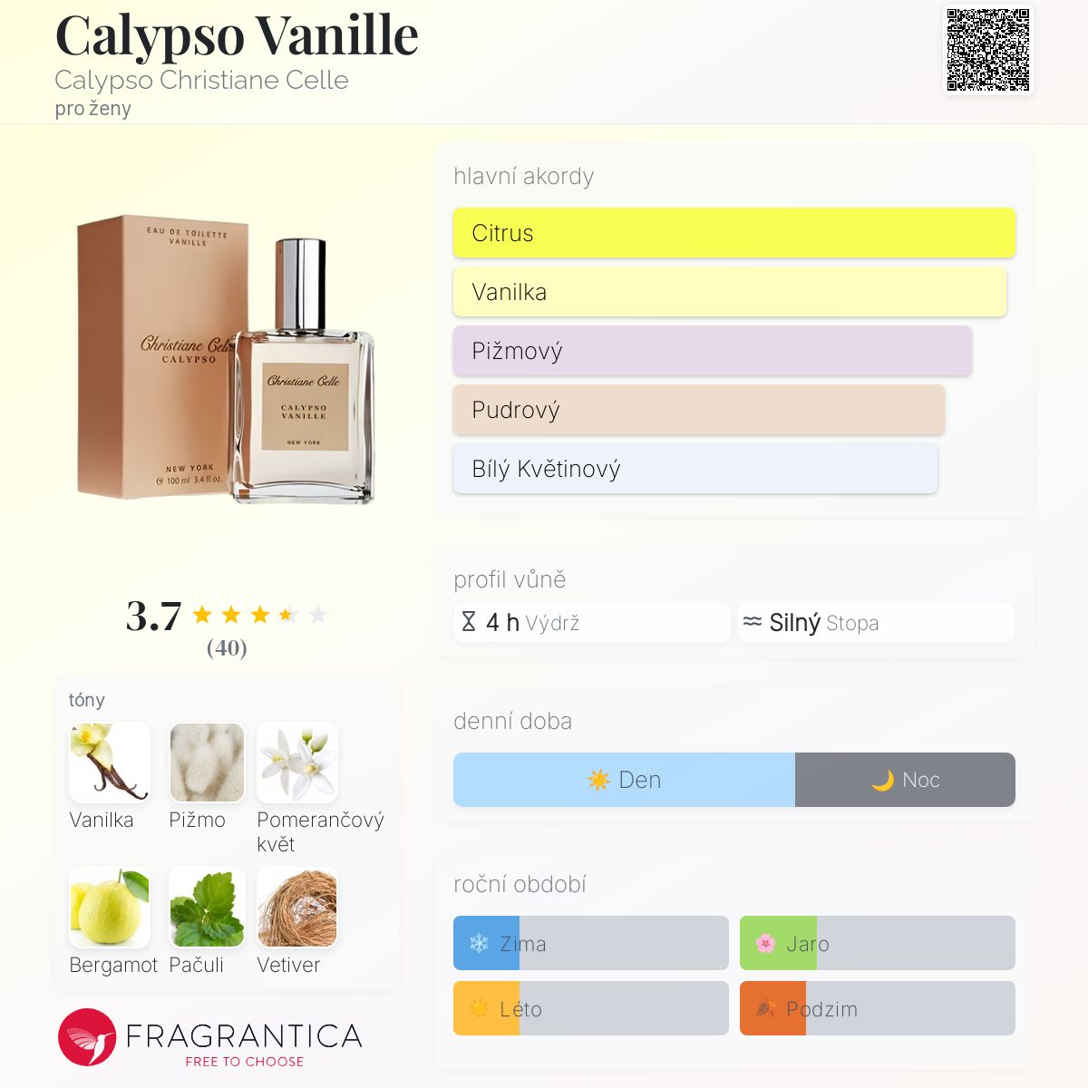 Calypso Vanille podle Calypso Christiane Celle je vůně pro ženy. Calypso Vanille byl/a uveden/a v roce 2004. Vrchní tóny jsou Pomerančový květ a Bergamot; střední tóny jsouVanilka a Pačuli ; základní tóny jsou Bílé pižmo a Vetiver.