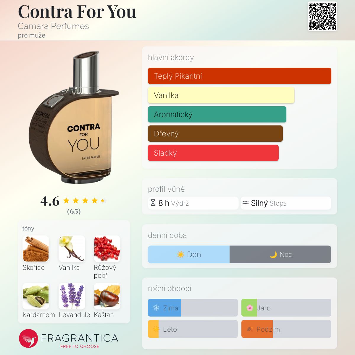 Contra For You podle Camara Perfumes je Aromatic Fruity vůně pro muže. Contra For You byl/a uveden/a v roce 2022. Vrchní tóny jsou Růžový pepř, Kardamom, Fialkový list a Máta; střední tóny jsouSkořice, Levandule, Ananas, Meloun a Šalvěj ; základní tóny jsou Vanilka, Kaštan, Guajakové dřevo, Fazole tonka, Jantarové dřevo a Cedr.