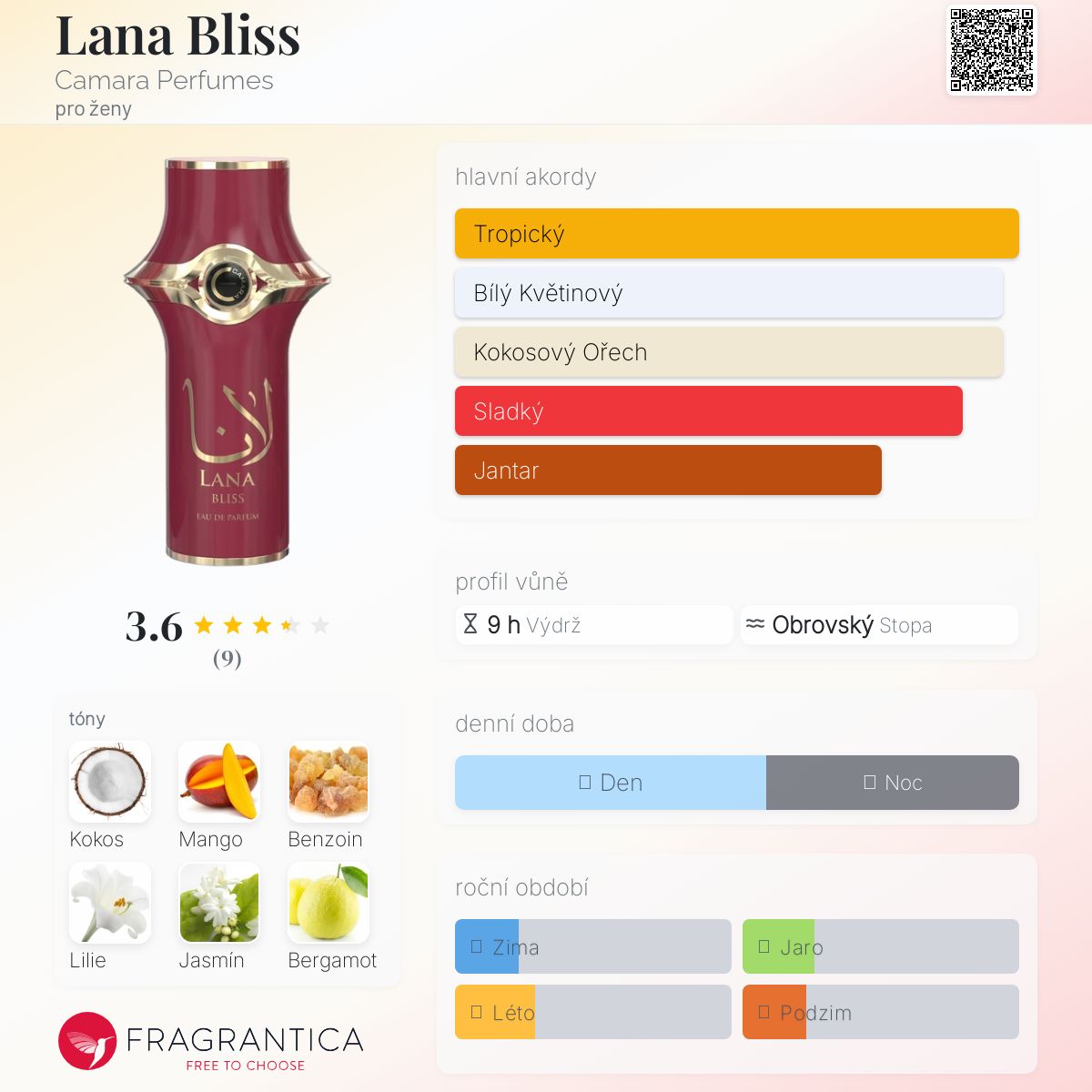 Lana Bliss podle Camara Perfumes je Floral Fruity vůně pro ženy. Toto je nová vůně. Lana Bliss byl/a uveden/a v roce 2025. Vrchní tóny jsou Kokosové mléko a Bergamot; střední tóny jsouTygří lilie, Jasmín a Frézie ; základní tóny jsou Mango, Benzoin a Pižmo.