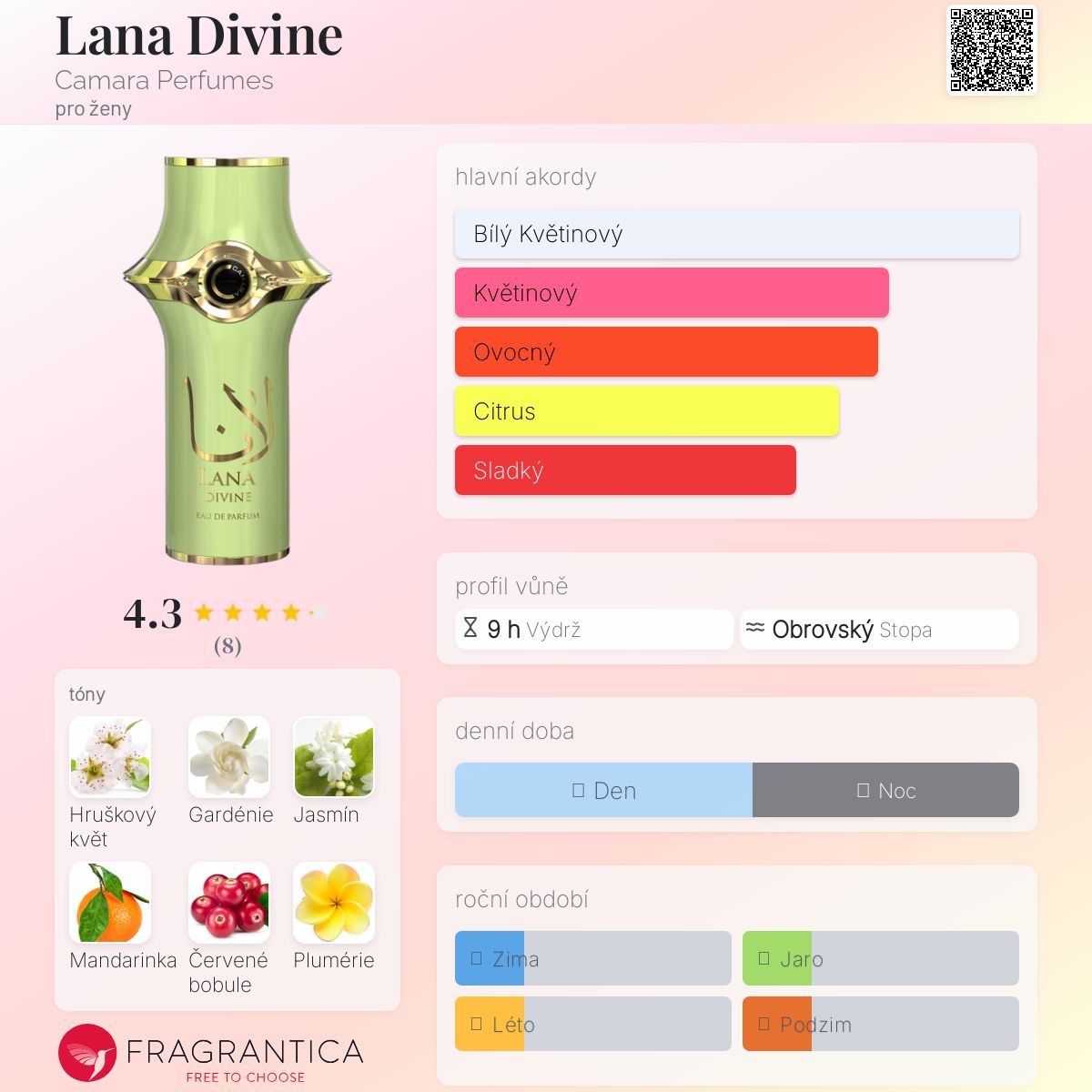 Lana Divine podle Camara Perfumes je Floral Fruity Gourmand vůně pro ženy. Toto je nová vůně. Lana Divine byl/a uveden/a v roce 2025. Vrchní tóny jsou Hruškový květ, Italská mandarinka a Červené bobule; střední tóny jsouGardénie, Jasmín a Plumérie ; základní tóny jsou Hnědý cukr a Pačuli.