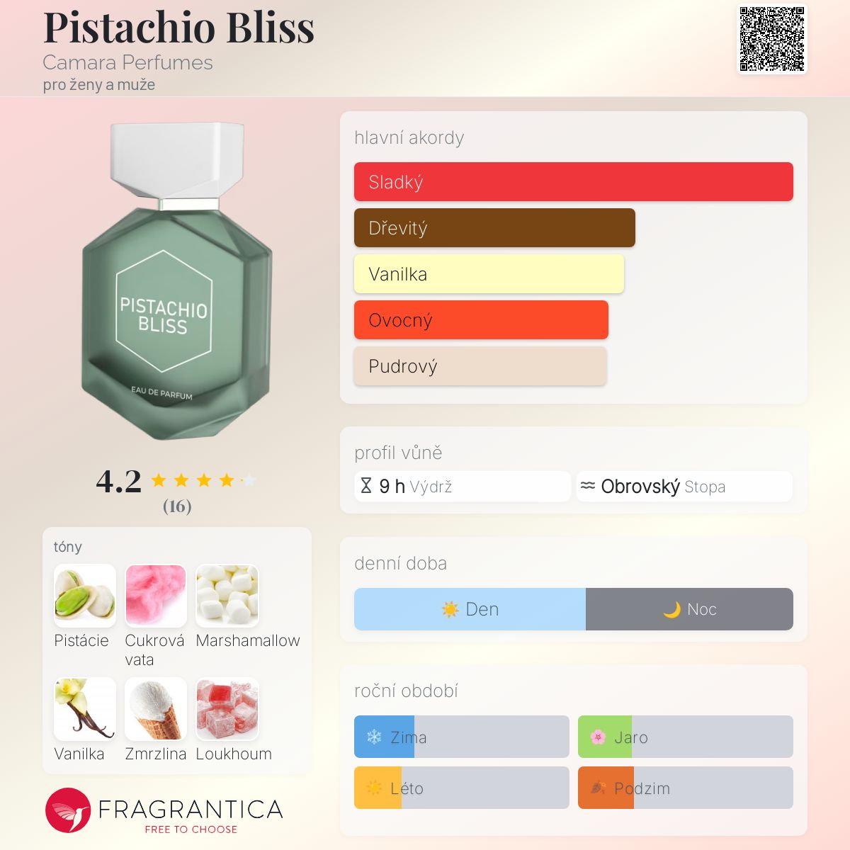 Pistachio Bliss podle Camara Perfumes je Floral Fruity Gourmand vůně pro ženy a muže. Toto je nová vůně. Pistachio Bliss byl/a uveden/a v roce 2025. Vrchní tóny jsou Pistácie, Zmrzlina, Lískový oříšek, Rum, Bergamot a Kardamom; střední tóny jsouCukrová vata, Maliny, Broskev, Pivoňka, Hruška, Konvalinka, Pelargónie a Jasmín ; základní tóny jsou Marshamallow, Vanilka, Loukhoum, Šlehačka, Santalové dřevo, Cedr a Kakao.