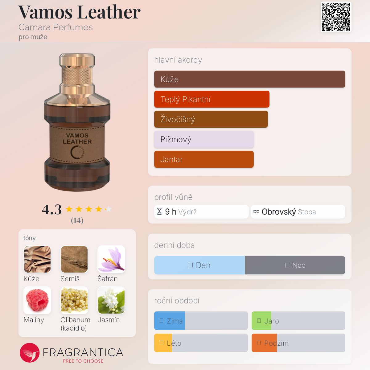 Vamos Leather podle Camara Perfumes je Leather vůně pro muže. Vamos Leather byl/a uveden/a v roce 2023. Vrchní tóny jsou Šafrán, Maliny a Tymián; střední tóny jsouOlibanum a Jasmín ; základní tóny jsou Kůže, Semiš, Pačuli, Dřevité tóny a Jantar (ambra).