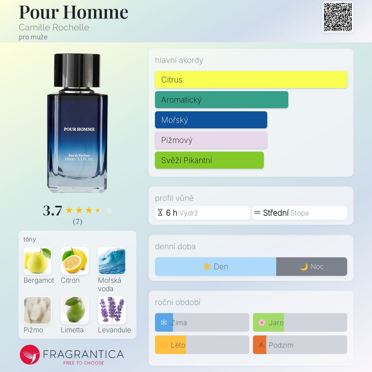 Pour Homme podle Camille Rochelle je Woody Aquatic vůně pro muže. Pour Homme byl/a uveden/a v roce 2023. "Nosem" za touto vůní je Irene Farmachidi. Vrchní tóny jsou Bergamot, Citrón, Mořská voda a Limetta; střední tóny jsouLevandule a Brambořík ; základní tóny jsou Pižmo, Jantar (ambra), Pačuli a Dřevité tóny.