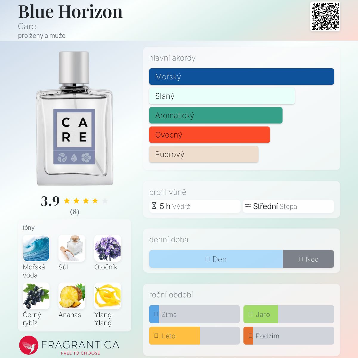 Blue Horizon podle Care je vůně pro ženy a muže. Toto je nová vůně. Blue Horizon byl/a uveden/a v roce 2024. "Nosem" za touto vůní je Coralie Spicher. Vrchní tóny jsou Mořské tóny, Sůl, Černý rybíz a Ananas; střední tóny jsouOtočník, Ylang-Ylang, Levandule a Cypřiš ; základní tóny jsou Naplavené dříví, Bílé pižmo a Mech.
