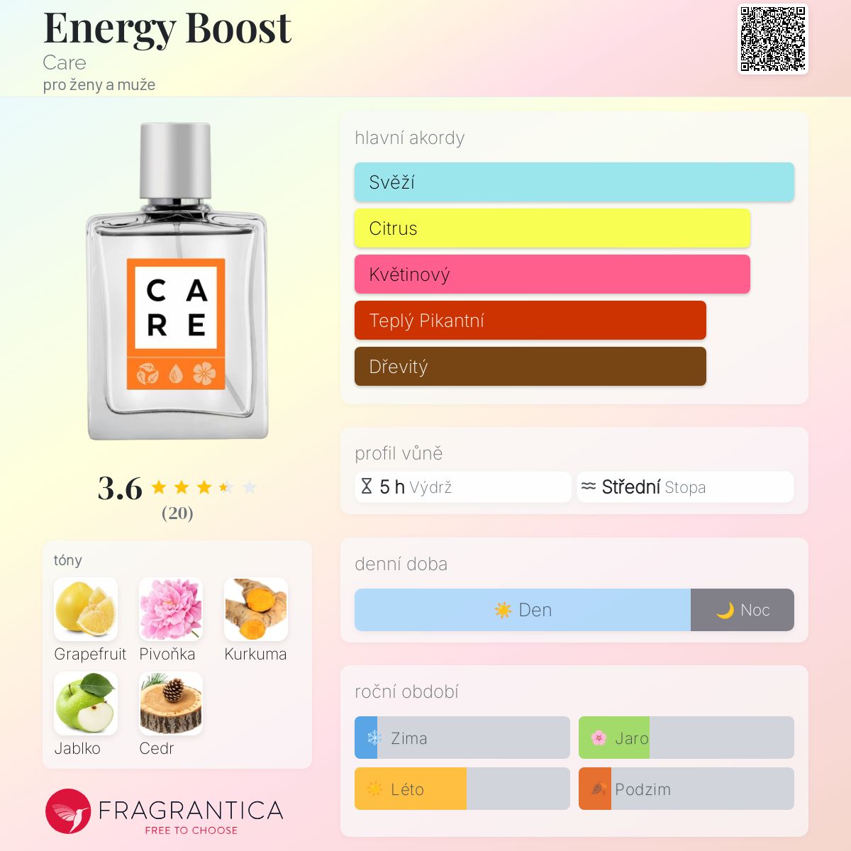 Energy Boost podle Care je Floral Fruity vůně pro ženy a muže. Energy Boost byl/a uveden/a v roce 2023. Vrchní tóny jsou Grapefruit a Kurkuma; střední tóny jsouPivoňka a Jablko ; základní tón je Cedr.