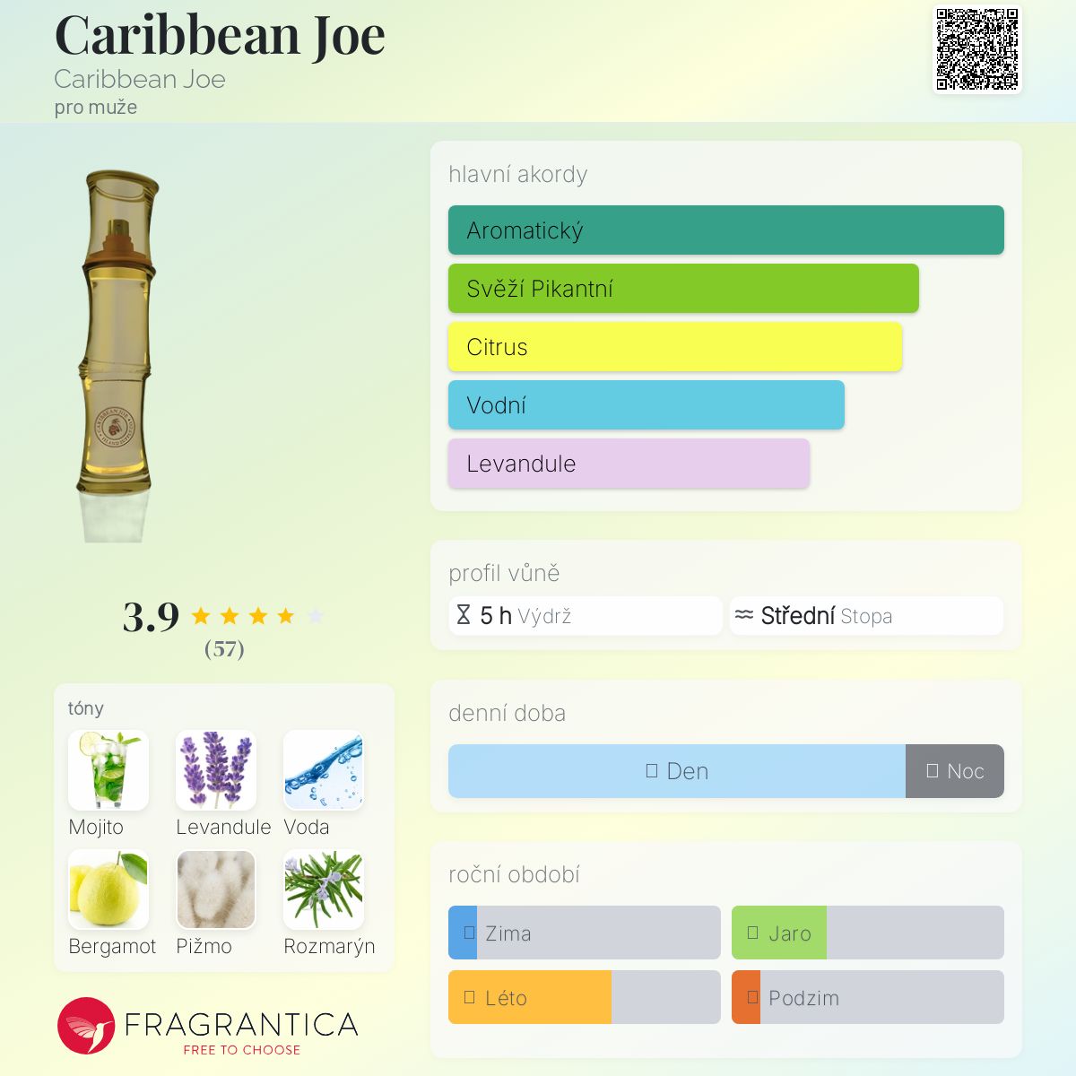 Caribbean Joe podle Caribbean Joe je Aromatic Aquatic vůně pro muže. Vrchní tóny jsou Mojito, Bergamot a List koriandru; střední tóny jsouLevandule, Vodnaté tóny, Rozmarýn a Pelargónie ; základní tóny jsou Pižmo, Bílý rum, Mořská řasa, Dřevité tóny a Jantar (ambra).
