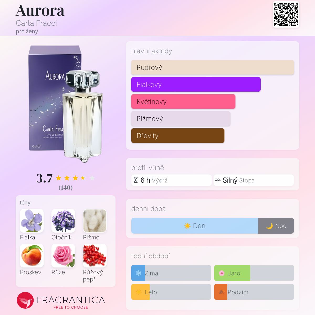Aurora podle Carla Fracci je Orientální Floral vůně pro ženy. Aurora byl/a uveden/a v roce 2012. Vrchní tóny jsou Růžový pepř a Bergamot; střední tóny jsouFialka, Broskev a Růže ; základní tóny jsou Otočník, Pižmo, Kůže a Cedr.