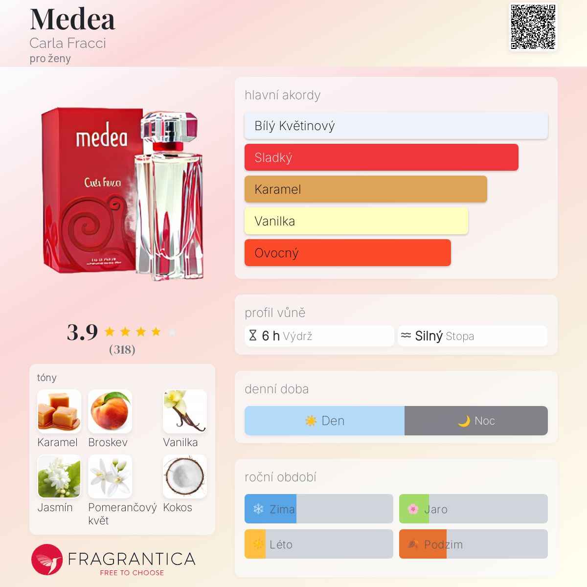 Medea podle Carla Fracci je Floral Fruity Gourmand vůně pro ženy. Medea byl/a uveden/a v roce 2006. Vrchní tóny jsou Citrusy a Frézie; střední tóny jsouJasmín, Pomerančový květ, Květ tiare, Růže a Konvalinka ; základní tóny jsou Karamel, Broskev, Vanilka, Kokos, Jantar (ambra), Pižmo a Vzácné dřevo.