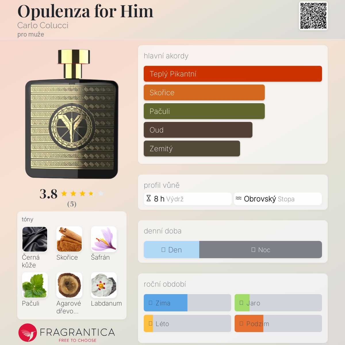 Opulenza for Him podle Carlo Colucci je Orientální Woody vůně pro muže. Toto je nová vůně. Opulenza for Him byl/a uveden/a v roce 2024. Vrchní tóny jsou Skořice a Šafrán; střední tóny jsouČerná kůže, Pačuli, Levandule a Cedr ; základní tóny jsou Agarové dřevo (oud), Labdanum, Santalové dřevo a Pižmo.