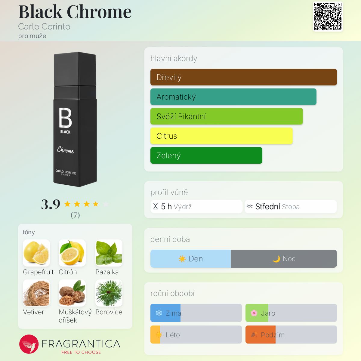 Black Chrome podle Carlo Corinto je Woody Aromatic vůně pro muže. Black Chrome byl/a uveden/a v roce 2015. Vrchní tóny jsou Grapefruit, Citrón a Bazalka; střední tóny jsouVetiver, Muškátový oříšek a Borovice ; základní tóny jsou Santalové dřevo, Pačuli a Jantar (ambra).