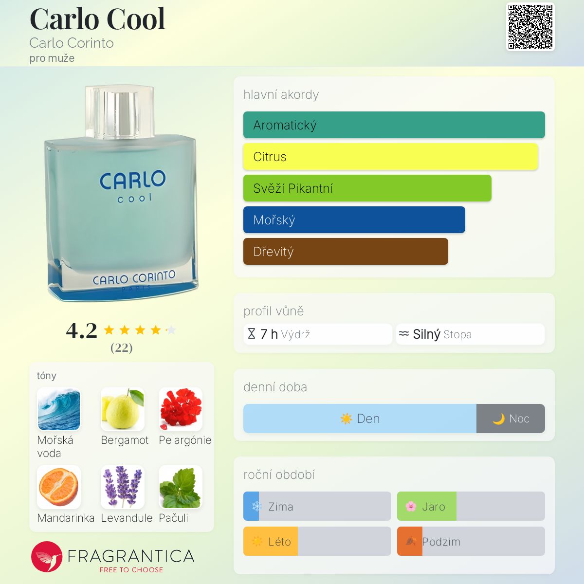 Carlo Cool podle Carlo Corinto je Woody Aromatic vůně pro muže. Carlo Cool byl/a uveden/a v roce 2009. Vrchní tóny jsou Mořské tóny, Bergamot, Mandarinka a Ananas; střední tóny jsouPelargónie, Levandule, Vetiver a Aloe Vera ; základní tóny jsou Pačuli, Dubový mech, Santalové dřevo a Jantar (ambra).