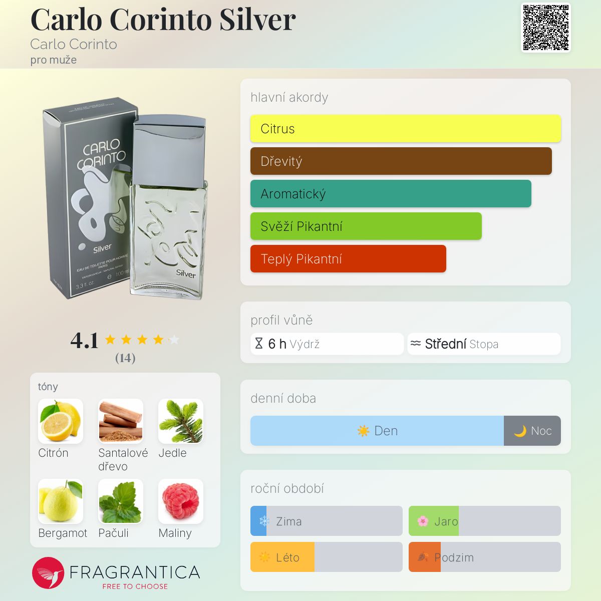 Carlo Corinto Silver podle Carlo Corinto je Orientální Spicy vůně pro muže. Carlo Corinto Silver byl/a uveden/a v roce 1984. Vrchní tóny jsou Citron amalfi , Bergamot, Yzop a Kardamom; střední tóny jsouMaliny, Levandule a Pelargónie ; základní tóny jsou Santalové dřevo, Jedle balzámová a Pačuli.