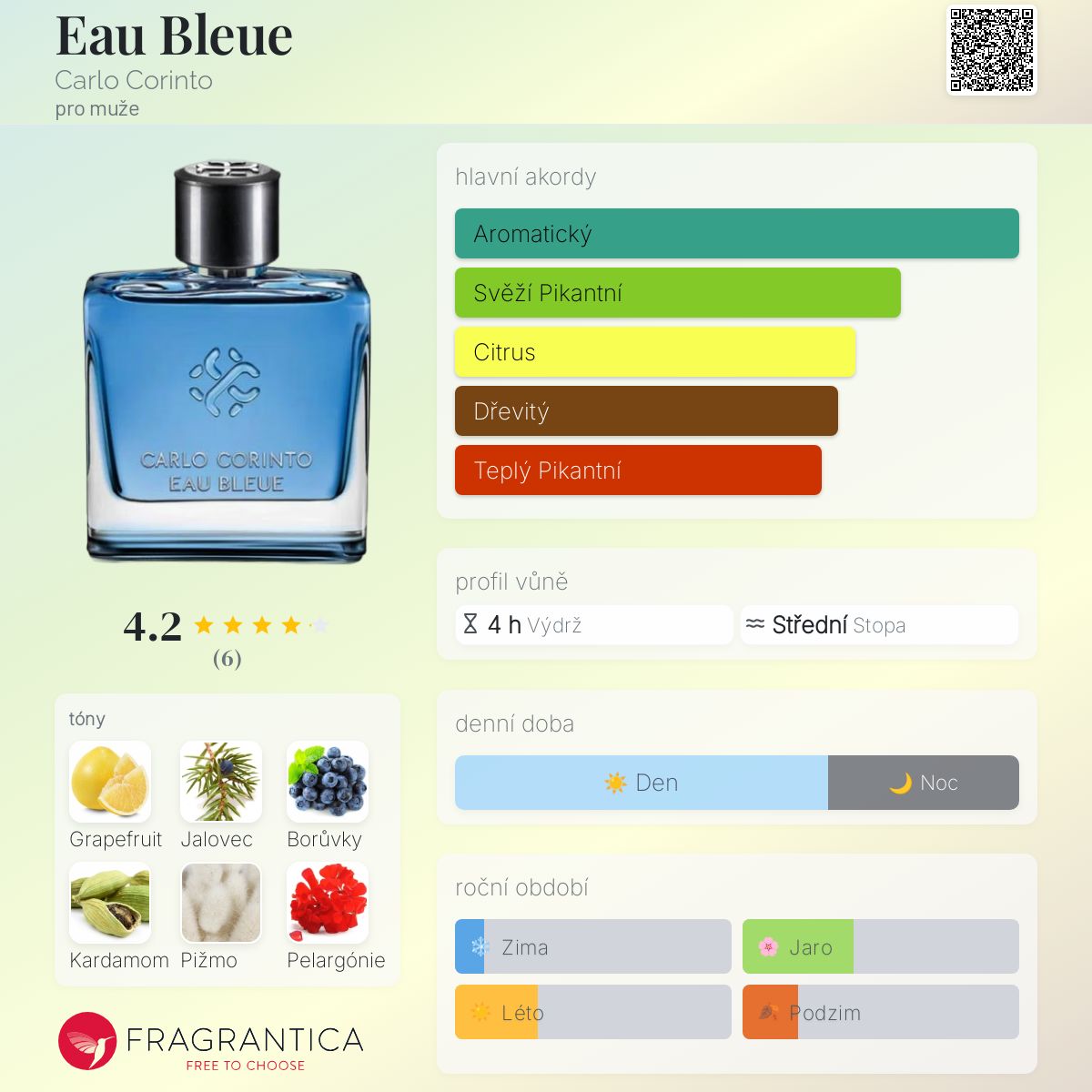 Eau Bleue podle Carlo Corinto je Woody Aromatic vůně pro muže. Toto je nová vůně. Eau Bleue byl/a uveden/a v roce 2024. Vrchní tóny jsou Grapefruit, Borůvky a Kardamom; střední tóny jsouJalovec, Pelargónie a Šalvěj ; základní tóny jsou Pižmo, Pačuli a Vetiver.