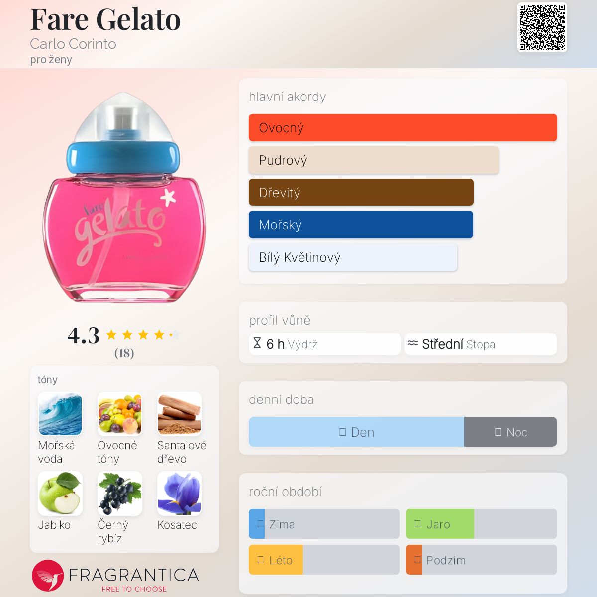 Fare Gelato podle Carlo Corinto je Floral Fruity vůně pro ženy. Fare Gelato byl/a uveden/a v roce 2011. Vrchní tóny jsou Mořská voda, Ovocné tóny, Granny Smith jablko a Černý rybíz; střední tóny jsouKosatec, Konvalinka, Růže a Jasmín ; základní tóny jsou Santalové dřevo, Pižmo, Jantar (ambra) a Fialka.