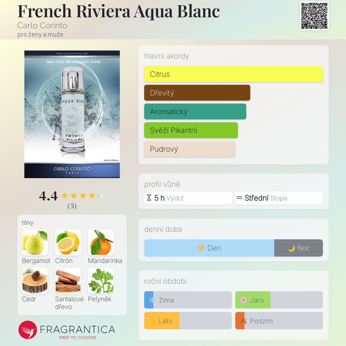 French Riviera Aqua Blanc podle Carlo Corinto je Citrus Aromatic vůně pro ženy a muže. Vrchní tóny jsou Bergamot, Citron amalfi a Pelyněk; střední tóny jsouMandarinka, Virginský cedr a Jantar (ambra) ; základní tóny jsou Santalové dřevo, Pižmo a Tabák.