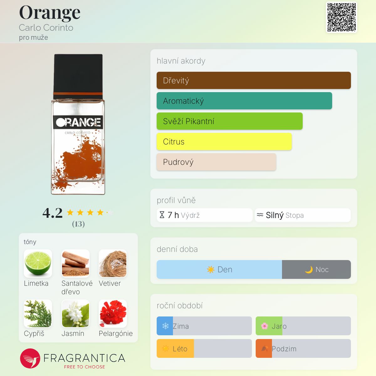Orange podle Carlo Corinto je Orientální Spicy vůně pro muže. Orange byl/a uveden/a v roce 2011. Vrchní tóny jsou Limetka, Cypřiš, Mořská voda a Šalvěj; střední tóny jsouJasmín, Pelargónie, Muškátový oříšek a Šafrán ; základní tóny jsou Santalové dřevo, Vetiver, Pižmo a Jantar (ambra).