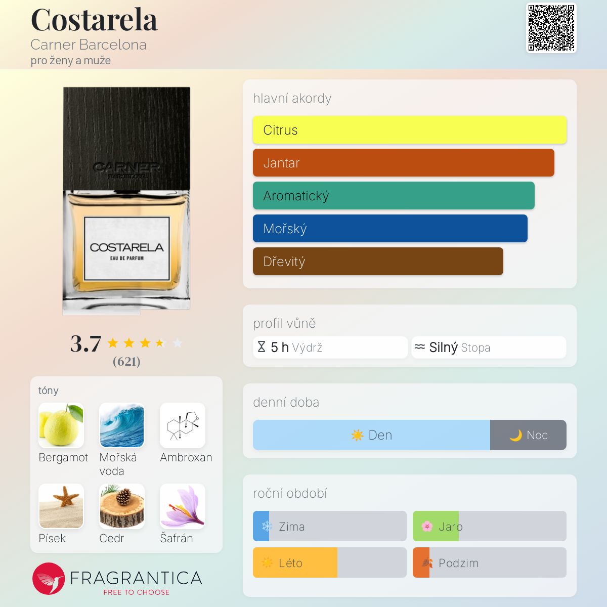 Costarela podle Carner Barcelona je Citrus Aromatic vůně pro ženy a muže. Costarela byl/a uveden/a v roce 2016. "Nosem" za touto vůní je Shyamala Maisondieu. Vrchní tóny jsou Bergamot a Šafrán; střední tóny jsouMořské tóny a Písek ; základní tóny jsou Ambroxan, Virginský cedr a Jantar (ambra).