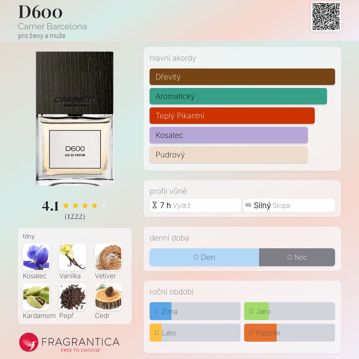 D600 podle Carner Barcelona je Woody Spicy vůně pro ženy a muže. D600 byl/a uveden/a v roce 2010. "Nosem" za touto vůní je Christophe Raynaud. Vrchní tóny jsou Pepř, Grapefruit a Bergamot; střední tóny jsouKosatec, Kardamom a Jasmín ; základní tóny jsou Vanilka, Vetiver a Virginský cedr.